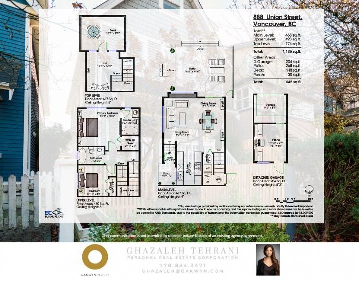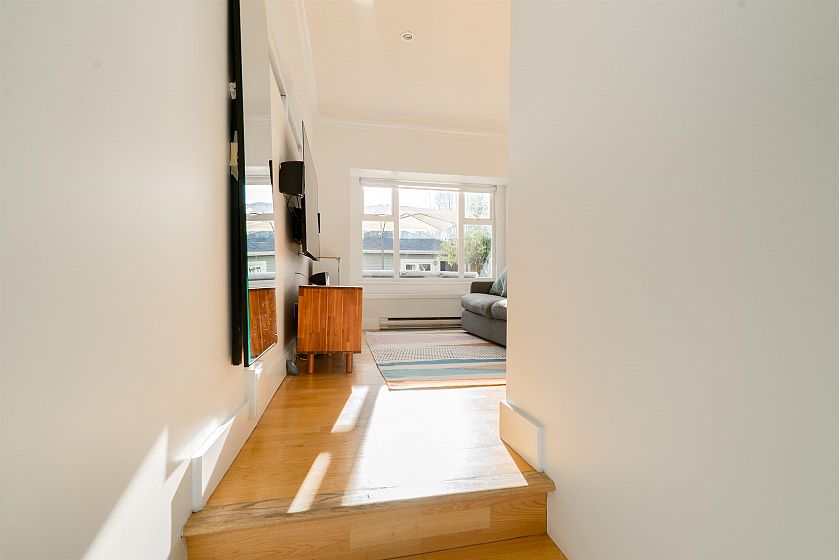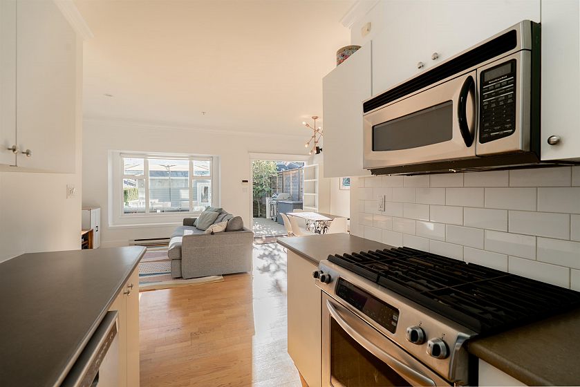 Lucky 8s! Sun-drenched back half duplex offers a peaceful oasis in the heart of the city. The main level is thoughtfully designed for effortless entertaining, with an open kitchen, dining, living flowing to a sunny south-facing deck & fenced yard. Upstairs a primary with ensuite & walk-in closet plus a second bedroom & bath. Top floor offers flexible space for a 3rd bedroom or office complete with a large patio. Detached garage serves as a finished office/gym & can easily revert to parking. Upgrades include new roof, fence, retaining wall, hot water tank, 2 decks, & indoor-outdoor sound system. On a quiet bike path, walk or ride to the seawall, DT, East Van shops & dining in minutes. Surrounded by parks, cozy cafe on the corner & French immersion elementary school.