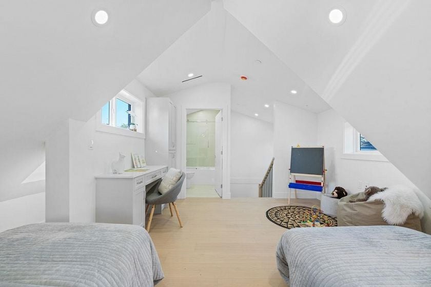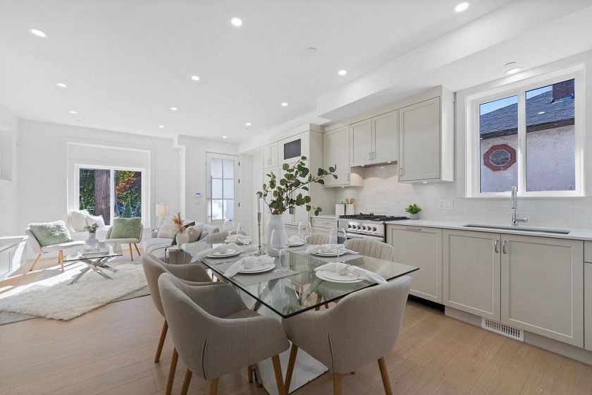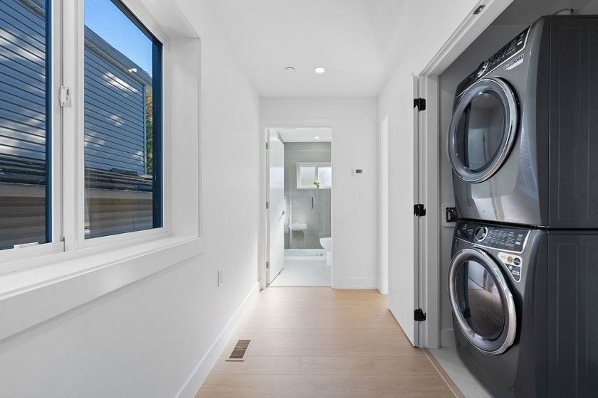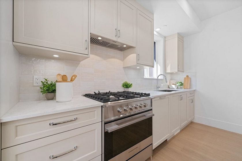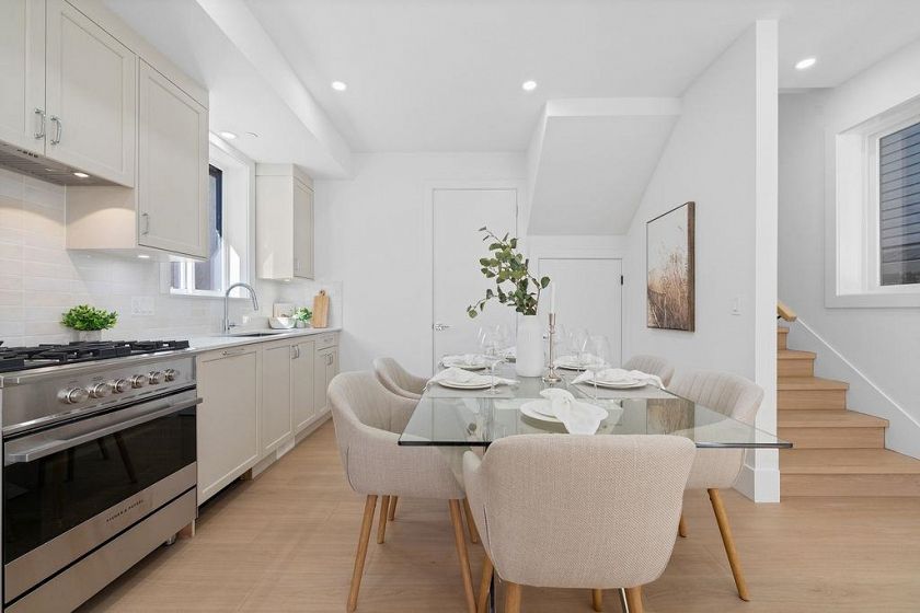 Brand new front half duplex offering over 1,300 sq.ft. of quality living space with 3 bedrooms & 2.5 baths, a fantastic value. From the gated entry & fenced yard to the bright open main floor, every detail impresses. Features include white oak floors, high ceilings, Fisher & Paykel integrated appliances, built-ins, AC & a designer powder room. Two bedrooms & full bath on the 2nd level, top floor primary with ensuite & private balcony, perfect for use as kids room. Sunny southern exposure fills the home with an abundance of light. Bonus single-car garage for secure parking or extra storage. Central location steps to schools, shopping & transit.