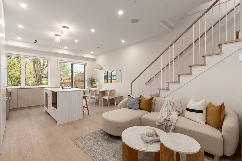 This newly built side-by-side duplex blends timeless design w/luxurious sophistication. With 4-beds/3.5 baths, the home flows effortlessly across 3 levels, ensuring no wasted space. The main floor feats a sleek Miele kitchen, anchoring the open living & dining areas, complete w/built-in bench seating & hidden storage. Sliding doors extend to a private backyard oasis w/built-in seating, perfect for entertaining. Upstairs are 3-beds & 2 full baths, incl. the spacious primary suite w/spa-inspired ensuite. Top floor is the ultimate retreat w/north & south patios, full bath, & flexible bdrm that can serve as an office, gym or media room. High-end finishes, custom millwork, heat pump +AC, 550 sqft crawl space, attached garage & an unbeatable location near Main Street complete this stunning home.