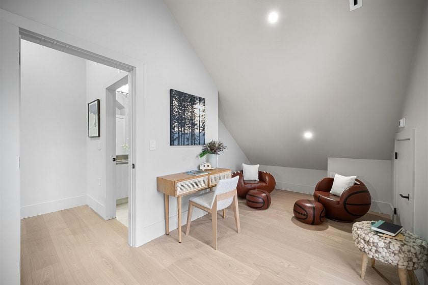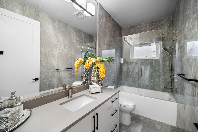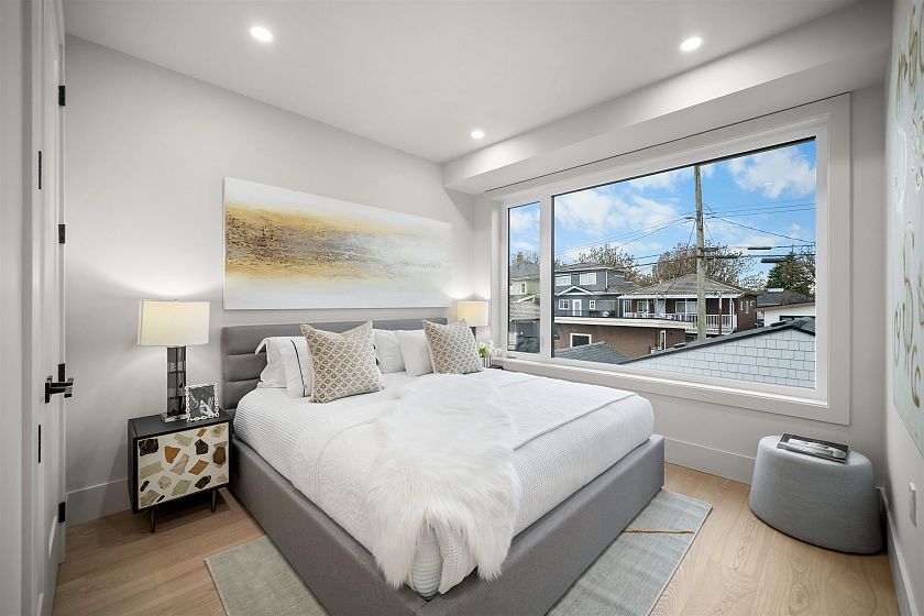 Experience unparalleled luxury in this brand-new 1/2 duplex in coveted Fraserhood, completed in collaboration with a highly esteemed interior/exterior expert. Wrapped in natural tones with refined exterior shingle work, this home features 3 bdrms with spa-inspired 2.5 baths and a sophisticated open layout. Highlights include Fisher & Paykel appliances, quartz countertops, custom cabinetry, hardwood floors, radiant heat, A/C heat pump, HRV and a fireplace. LED ambient lighting enhances key spaces. Approx 24'5 x 8 cemented patio and fully fenced yard extending outdoor living. Top-floor sanctuary boasts soaring ceilings and approx 12 x 11 private balcony with breathtaking Vancouver views. A detached EV-ready garage completes this impeccably crafted residence.