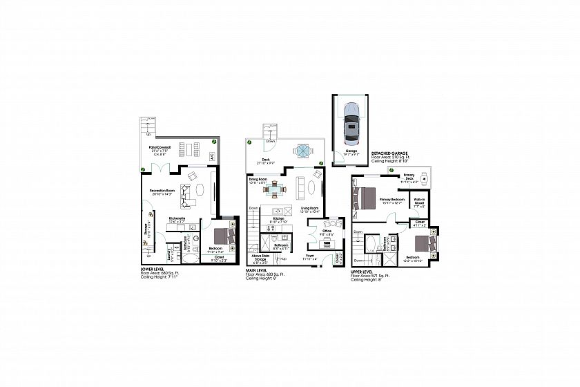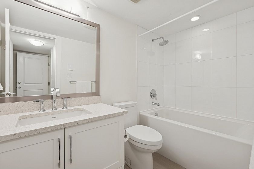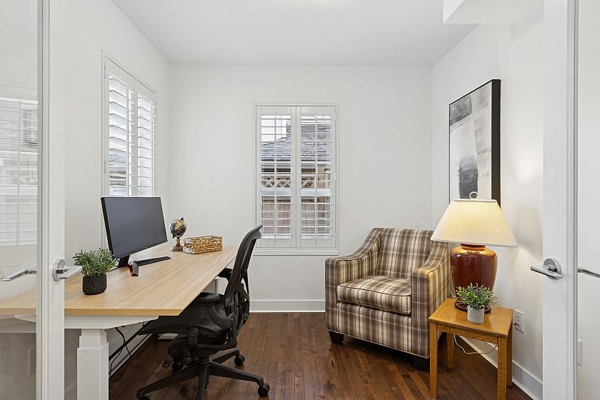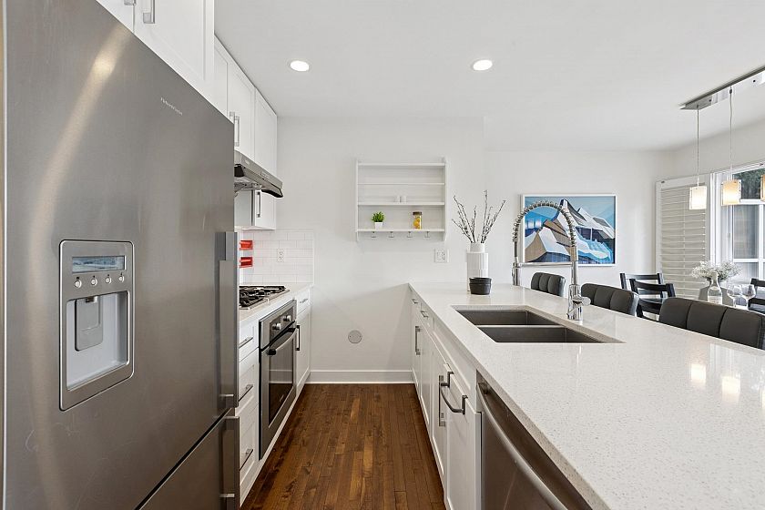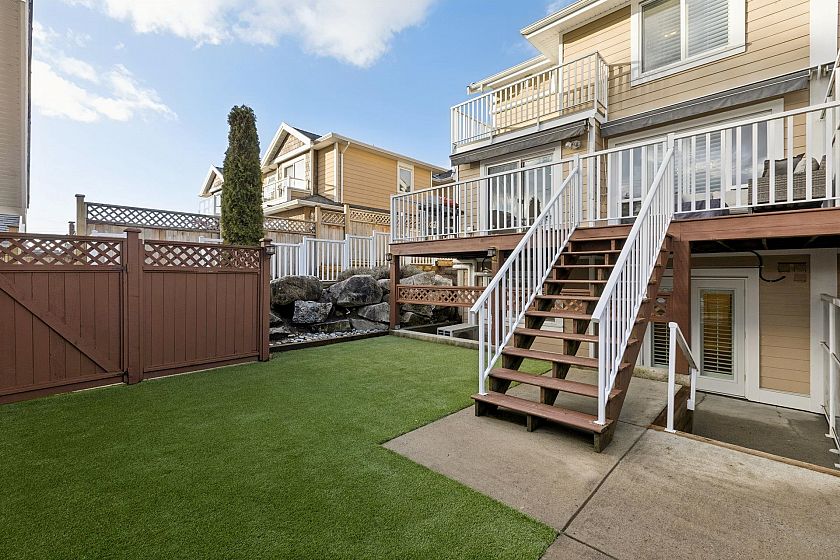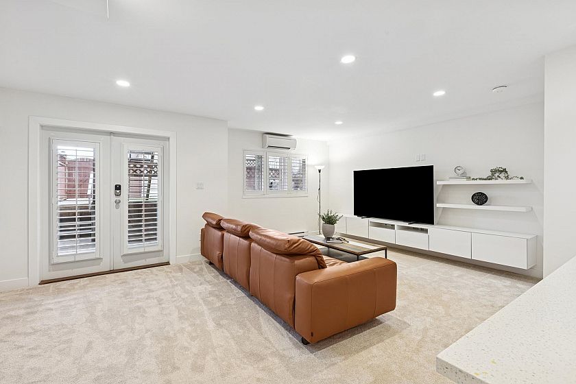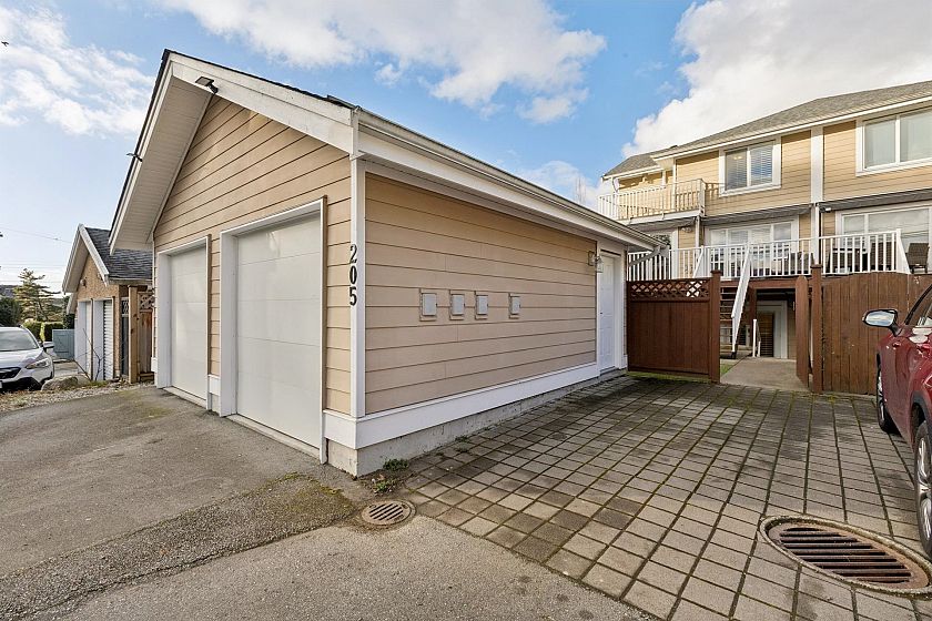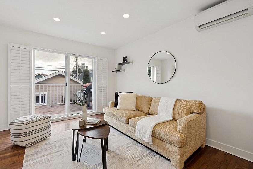 South-facing fourplex offering nearly 2,000 sq/ft of turn-key living. This 3-bed + den home features a house-scale layout across 3 levels. Main floor offers a designer kitchen with gas cooktop, hardwood floors, and a bright office with French doors. Transition outside to a south-facing deck and private fenced yard with artificial turf. Upstairs features a primary suite with walk-in closet and private SW balcony, plus a 2nd bedroom and spa-style bath. Lower level has a separate entrance, bedroom, and bath - ideal for a nanny suite or future rental (kitchenette ready). Recent upgrades include a high-efficiency heat pump (A/C on all floors), fresh paint, and new carpets. 2 parking (1 garage). Steps to the Green Necklace, Lonsdale shops, and the new Harry Jerome Rec Centre.