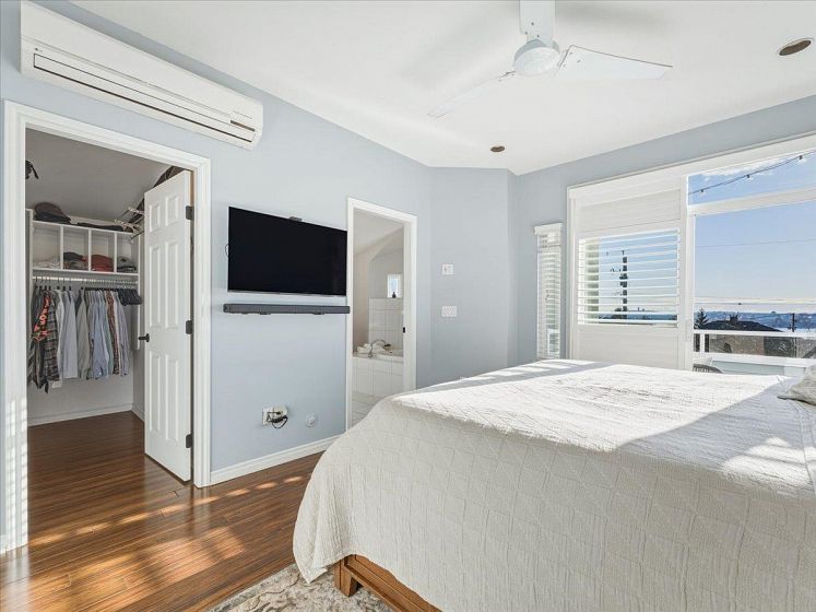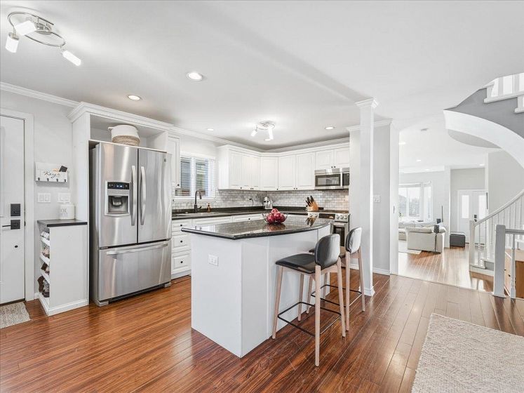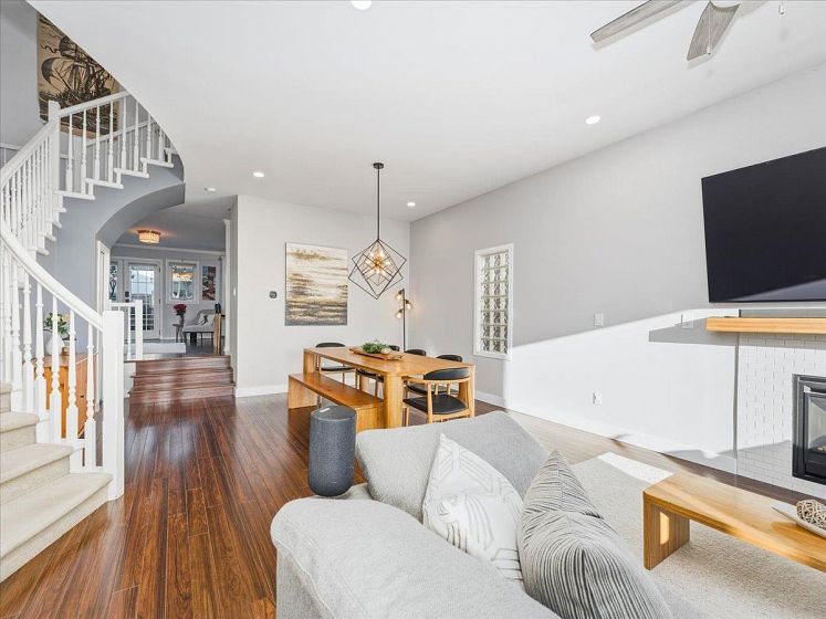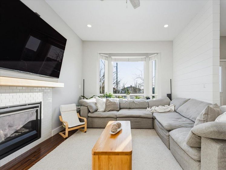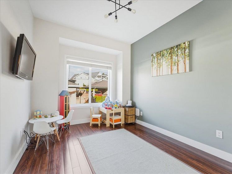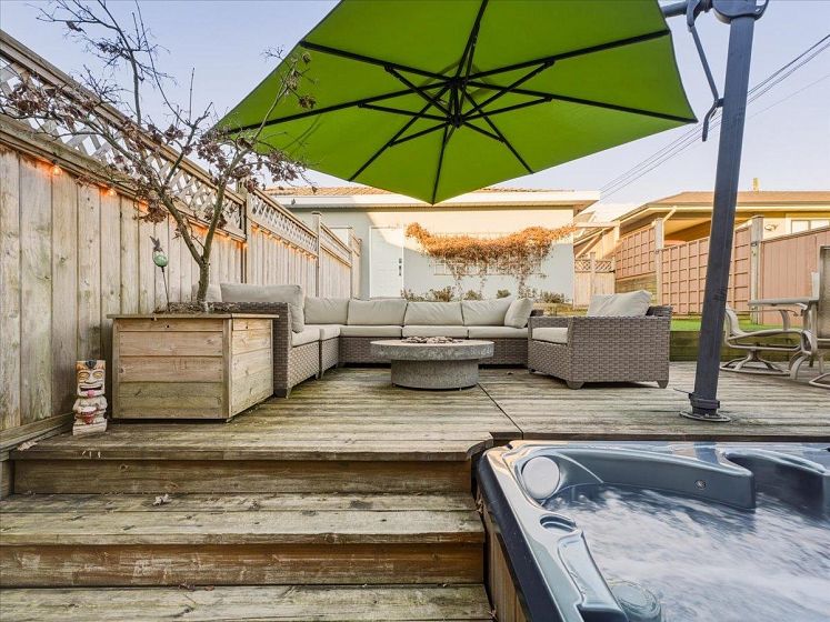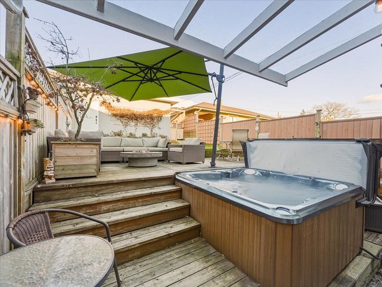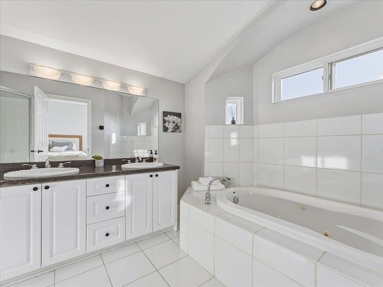 Welcome to a bright and elegant residence featuring soaring nearly 10-foot ceilings and a semi-spiral grand staircase illuminated by an octagonal skylight above. The open-concept layout offers 3 bedrooms upstairs with beautiful city and mountain views, RADIANT IN-FLOOR HEATING, and HARDWOOD flooring throughout the main and upper levels. The kitchen and family room open through French doors to a fully fenced backyard complete with a spacious deck, RLEAXING HOT TUB, and greenspace ideal for children to play. A versatile lower-level area with full bathroom and separate entrance provides excellent potential for a bachelor suite, home studio, or recreation space. Additional highlights include air conditioning in the primary bedroom, on-demand hot water, California shutters, and a 2 car-garage.
