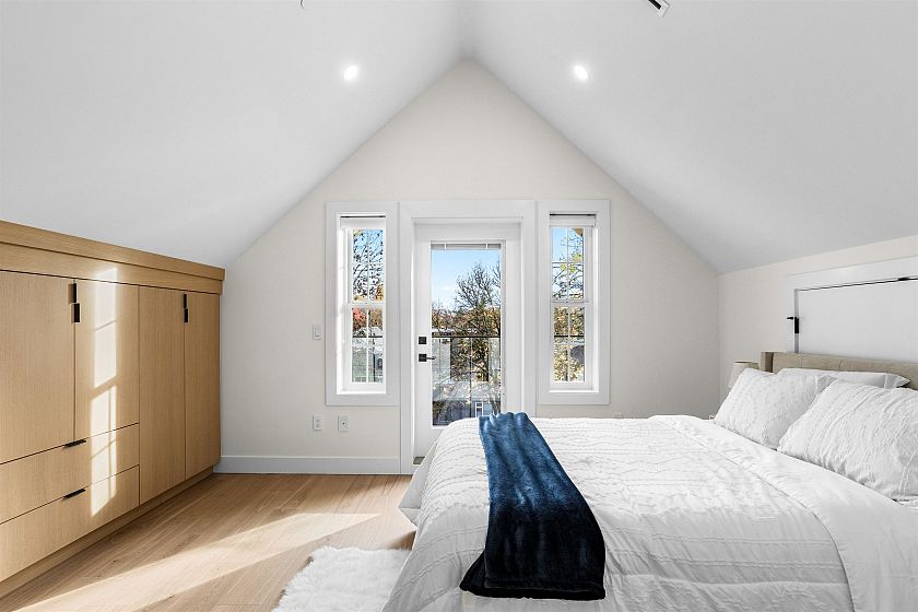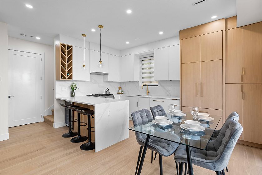 Beautifully crafted back unit duplex offering 3 bed 4 bath open concept living floor plan. Premium millwork, design package + elegant finishing built with attention to detail + functionality in mind. Urban farmhouse style that offers warm and inviting spaces from the moment you step inside. Kitchen is equipped w/ Fisher-Paykel integrated appliances package, custom cabinetry, wine cooler and pantry space. Engineered hardwood flooring, A/C heat pump, security systems, radiant floor heating + single car garages w/ EV parking. Quick access to schools, amenities, HWY1 access + short drive to Hastings Street shops.