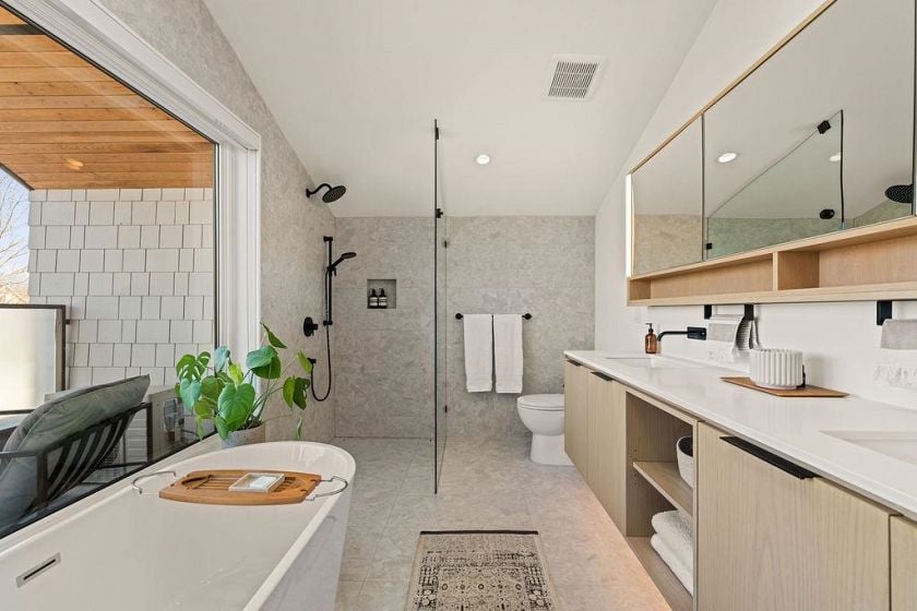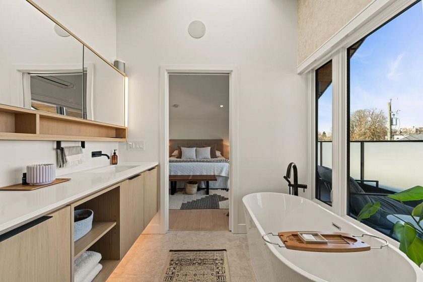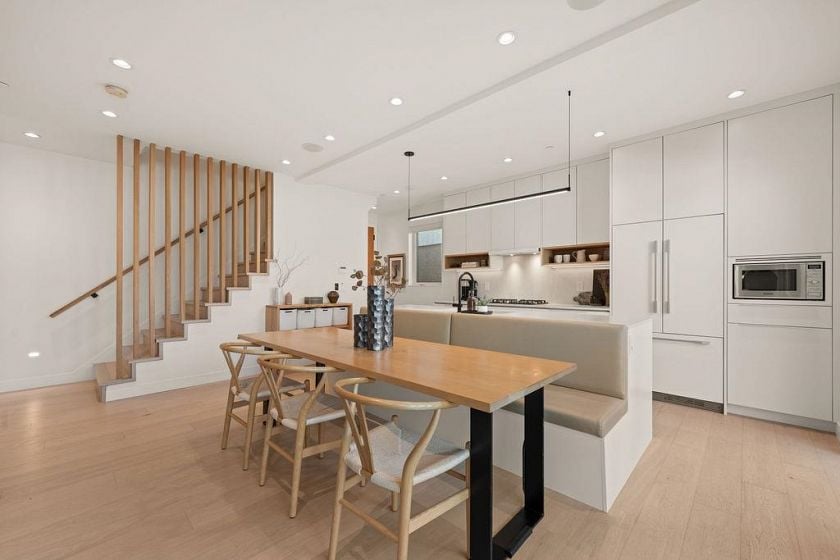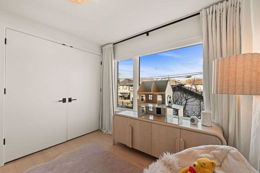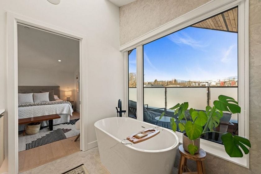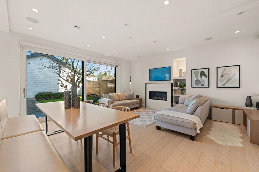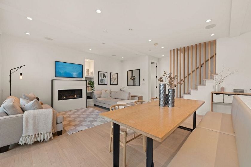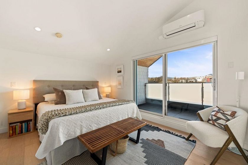 Turnkey without the GST! Like-new modern REAR duplex designed by award-winning 'Architrix Studio' — Blending style, a thoughtful design & highly functional spacious layout. 9' ceilings, oversized Euro sliding patio door, Large kitchen w/ integrated Fisher & Paykel appliances, Caesarstone counters, large island w/ built-in banquet accommodating a table for 8. Upstairs are 2 large beds, a spacious double sink bath & full-size laundry. Top floor primary suite ft vaulted ceiling, custom walk-in closet, a bright ensuite bath w/ tub & shower, & covered terrace w/ mountain views. Over-engineered pile foundation, super-insulated walls, Hardie-shaker exterior, radiant in-floor heating, AC on top level, blackout blinds & smart home integration w/ in-ceiling speakers.