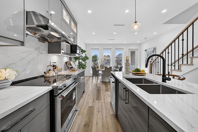 Nearly new side-by-side duplex in the heart of Marpole! Offering almost 2,000 sq.ft. of bright, well-designed living space with 3 spacious bedrooms upstairs and a legal 2-bedroom suite below—perfect as a mortgage helper. Quality finishes include engineered hardwood floors, high ceilings, and A/C for year-round comfort. Detached garage plus additional open parking. Prime location near top schools, parks, and just steps to Marine Gateway SkyTrain, shopping, and dining. 200-amp service with two Level-2 outlets, EV-ready. OPEN HOUSE: APR.19, SUN, 12:00-2:30PM