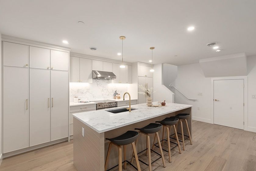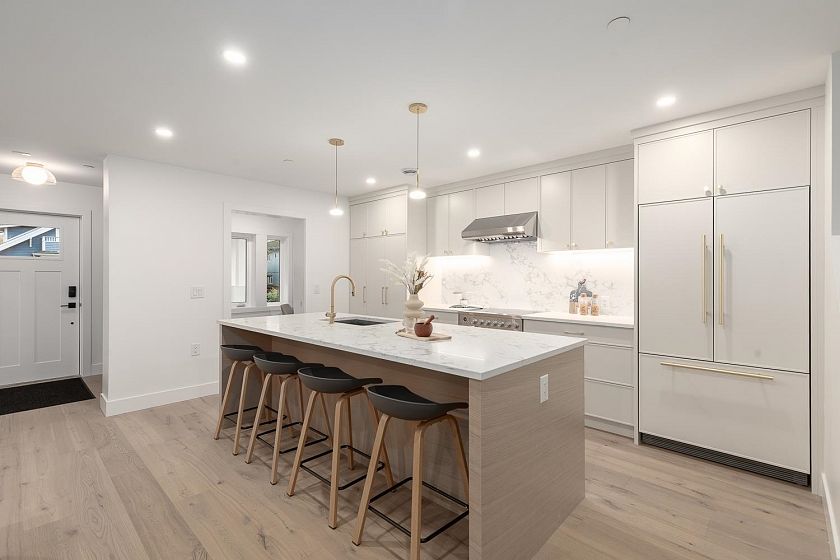 Welcome home to this bright & airy 3-bedroom, 2.5-bathroom front-facing duplex that boasts a spacious and open floor plan across 2 levels! The grand main level is made up of your living, dining, bar area, office, powder bath, and chef's kitchen that features quartz countertops, Fisher & Paykel appliances including a gas stove, and ample cabinetry. Upstairs you will find vaulted ceilings, all 3 bedrooms and 2 bathrooms; including the generous primary bedroom with tons of storage and the spa-like ensuite bathroom that is the perfect retreat. With a covered porch, heat pump for heating and cooling, sleek fixtures throughout, and a garage this home is the perfect balance of modern luxury and convenience. An amazing location close to Main & Fraser Street's amenities.