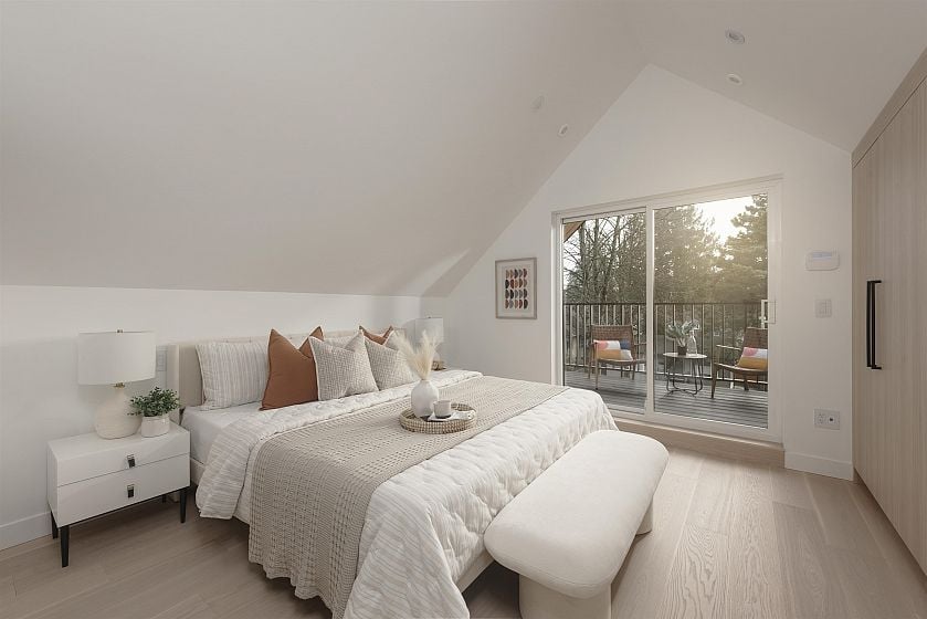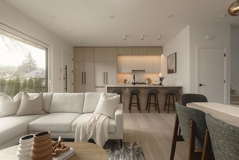 Situated in the heart of Kitsilano, this brand-new 3-bed + flexible enclosed den, 3.5-bath duplex showcases Trillium Homes’ signature quality & craftsmanship. Offering 1,576 sq.ft. across three well-planned levels, the home features soaring 9’7” ceilings on the main floor, vaulted ceilings in the primary bedroom, & a covered balcony for seamless indoor-outdoor living. The enclosed den is generously sized—ideal as a home office or guest room. The gourmet kitchen is equipped with WOLF, Miele, & Fulgor Milano appliances, custom millwork, & quartz finishes. Comfort is elevated with a high-efficiency heat pump, HRV system, in-floor heated bathrooms, & enhanced sound insulation. EV-ready garage, smart home features, ample storage, & a full 2-5-10 New Home Warranty complete this exceptional home.