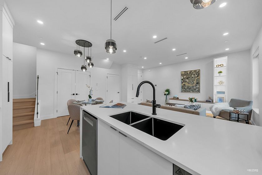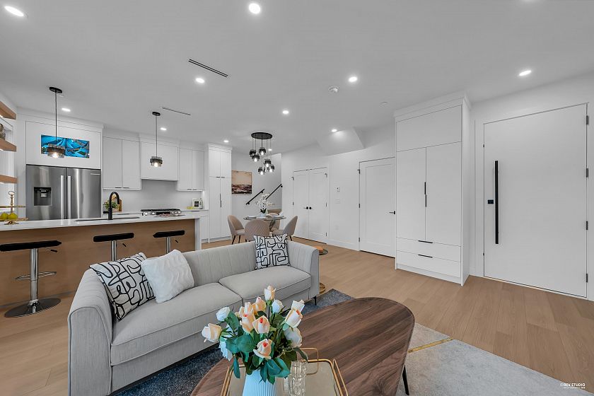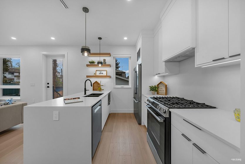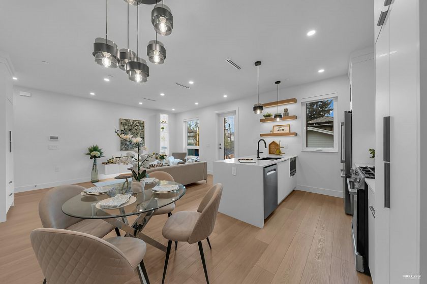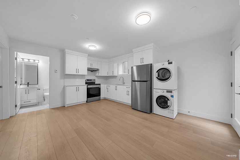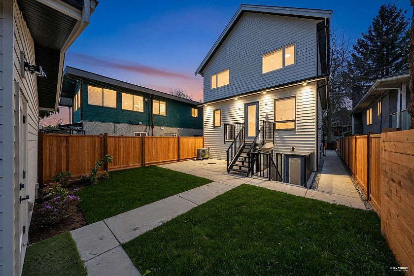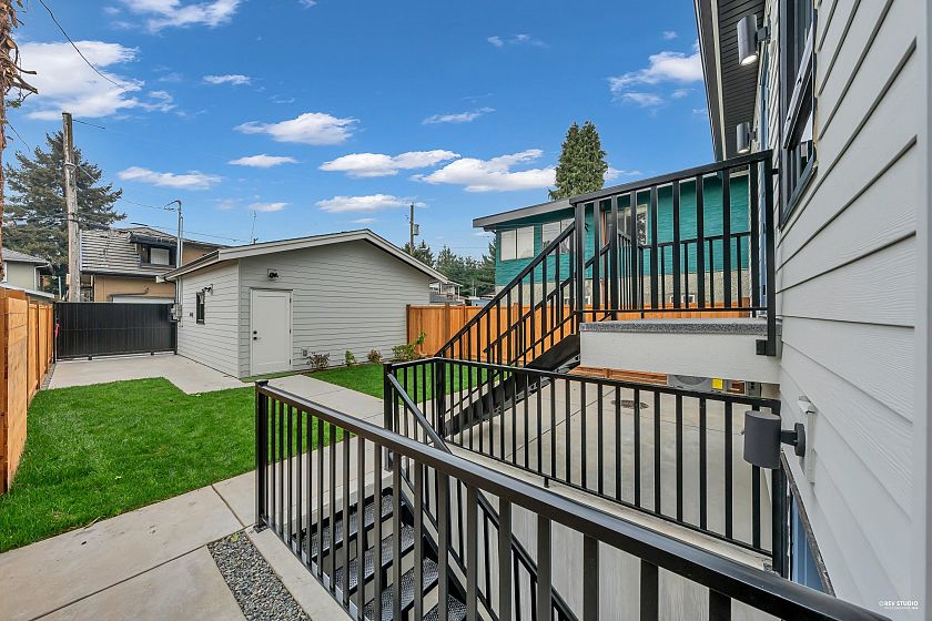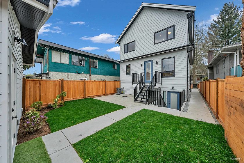 Brand-new northeast-facing BACK duplex offering 1,637 sqft of modern living w/a functional layout and quality craftsmanship. This well-built home features 3 spacious bdrms upstairs, 2.5 baths, and a legal 2-bdrm basement suite—perfect as a mortgage helper or for extended family. The open-concept main floor boasts a bright living and dining area, a stylish kitchen w/top-brand s/s appliances, including a gas range. All bdrms on the same level. Enjoy year-round comfort with a heat pump, HVAC system, and A/C. Includes single garage w/EV plus an additional carport parking space. Secured storage/locker under the porch. Private fenced backyard for kids or pets. Minutes to 29th Ave SkyTrain, parks, schools, shops, and restaurants along Kingsway. Open House Sun. May 3rd, 2-4PM