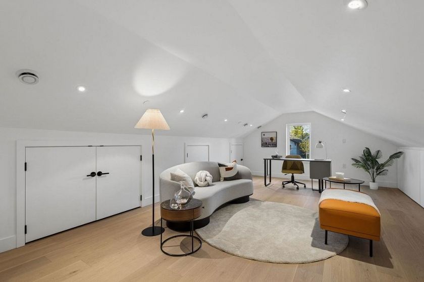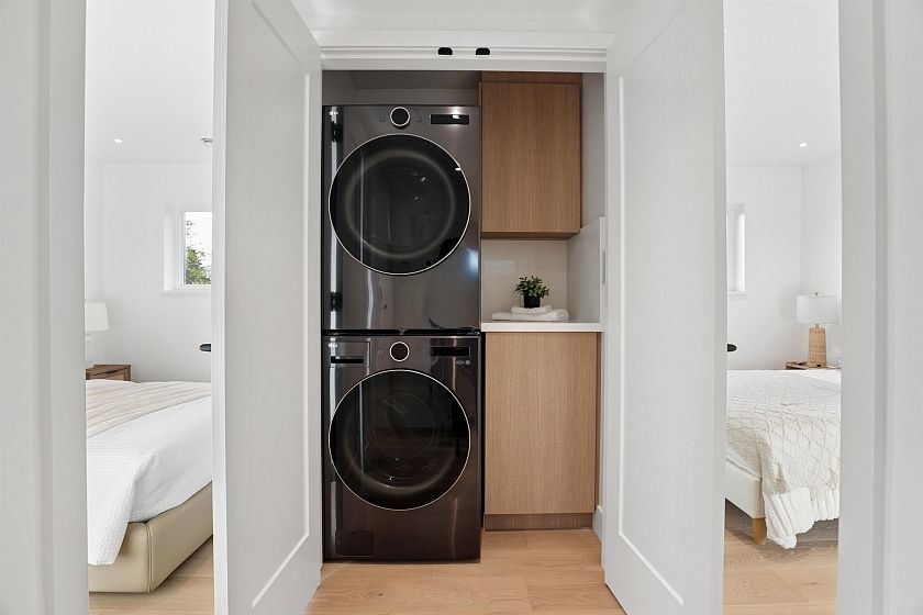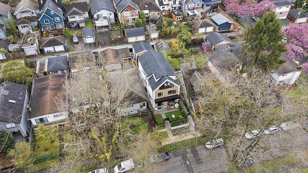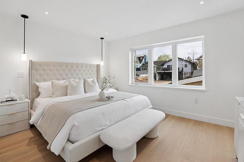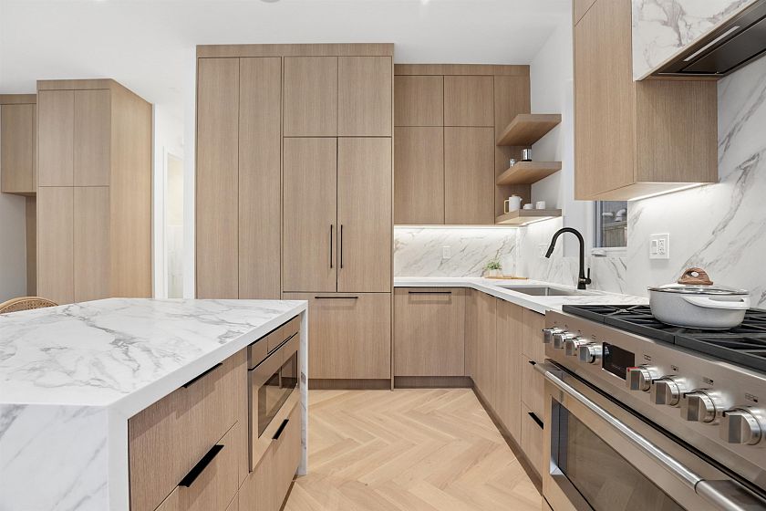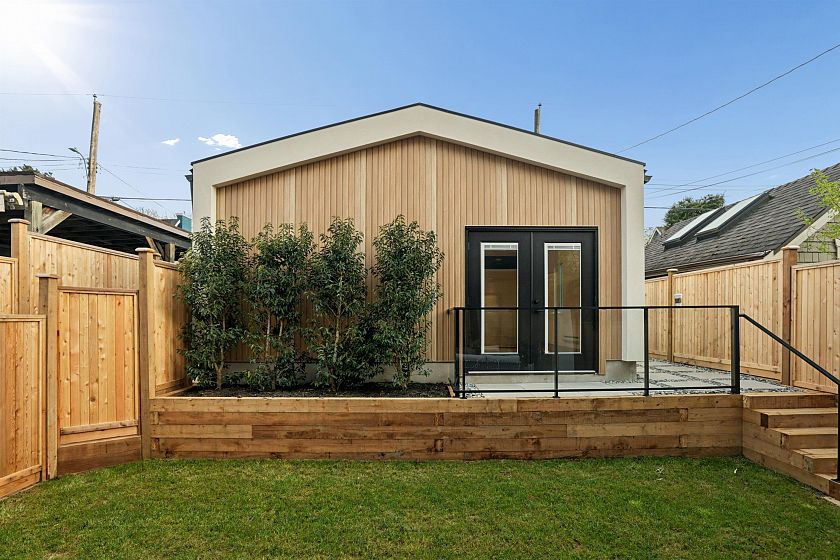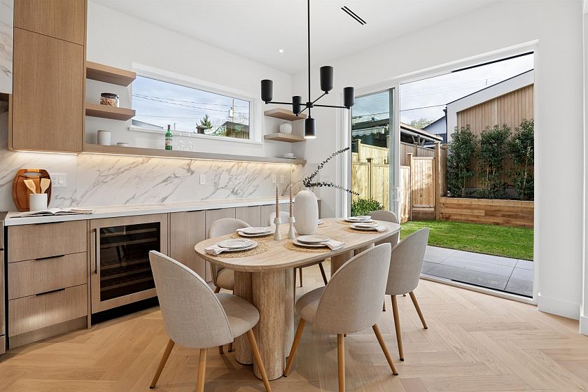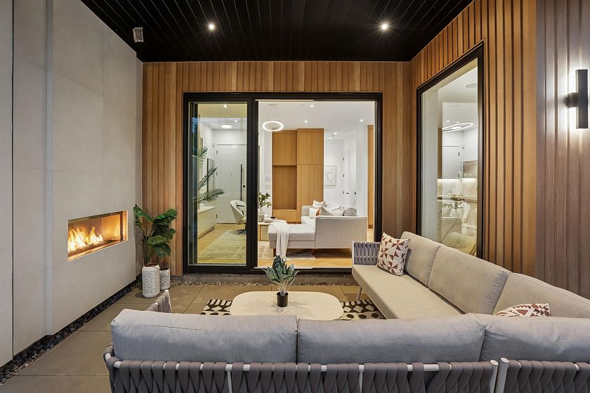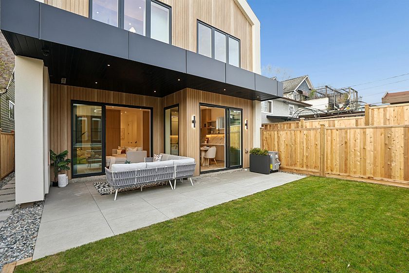 Exceptional south-facing back duplex by Mirani Homes with all 3 bedrooms on 2nd level in the vibrant community driving neighbourhood of Grandview Woodlands, just steps to Commercial Drive. Offering over 1,800 SF, this 3 bedroom & large den, 3 bath home features luxury finishes with attention to detail. Bright, well-designed layout with herringbone hardwood floors, waterfall island kitchen, Fulgor Milano appliances, custom cabinetry, built-in storage, and thoughtfully used nooks throughout. Main floor opens from both the living and dining areas by sliding glass walls to a private fenced yard with a covered paved patio and outdoor fireplace. Primary bedroom includes a walk-in closet and spa-inspired ensuite with double sinks.