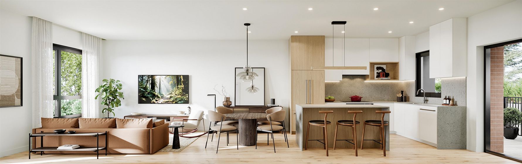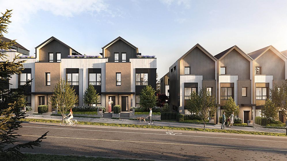 Introducing Ridgewood Row, a limited collection of 32 contemporary townhomes and garden flats in the heart of Edgemont Village. Interior design by Ross & Company Interiors brings warmth and refinement to every space, layering natural materials with timeless finishes. This elegant two bedroom, two bathroom garden flat features soaring 12 foot ceilings and dramatic double height windows that fill the home with natural southern light. A generous private patio overlooks the quiet courtyard, creating a seamless indoor outdoor living experience. Designed by Integra Architecture and built to meet Passive House standards, each home includes engineered hardwood flooring, Caesarstone countertops, and a premium Fisher & Paykel Series 7 appliance package. Additional homes available.