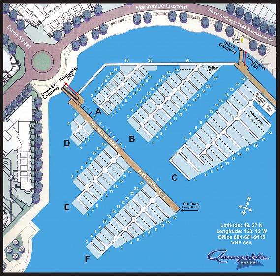 Slip D7 — 35' x ~21' extra-wide berth on D-Dock at Quayside Marina, the only strata-titled freehold marina in the heart of Vancouver's Yaletown. Own, don't lease. Full-time dockmaster, video security, fob access, sewage pump at every slip, power (30/50/100 amp) available, water, phone/cable, washrooms, showers & laundry. Davie St gangway access to concrete floats. Steps to the Seawall, Yaletown Ferry Dock, Roundhouse Skytrain Station & world-class dining. Minutes to English Bay. Slips at Quayside rarely come to market — don't miss this one!