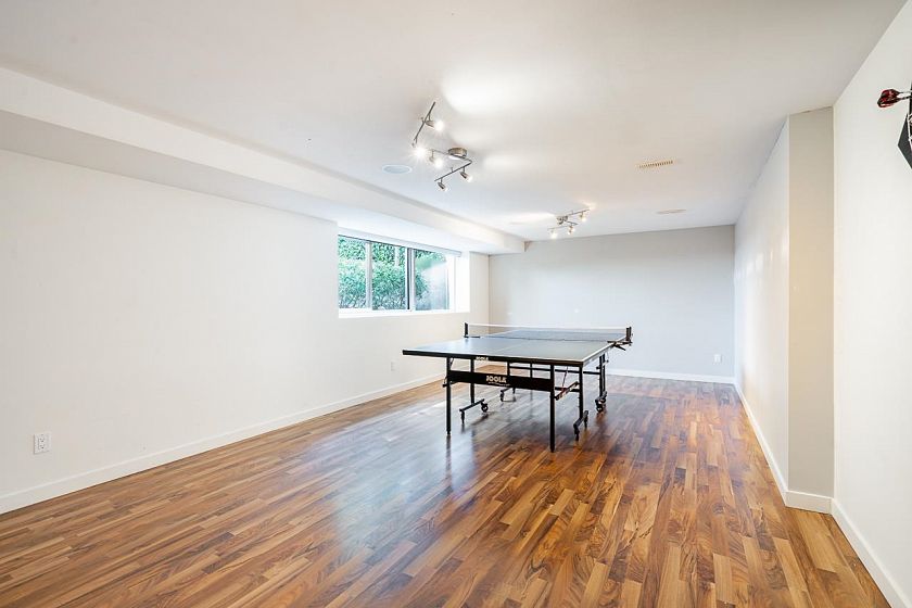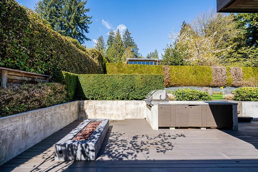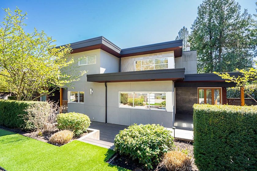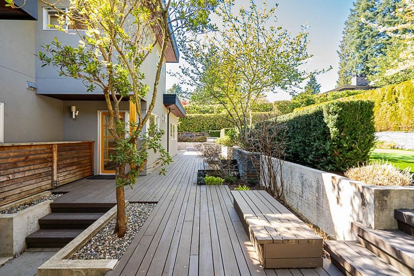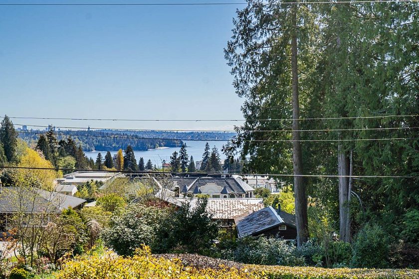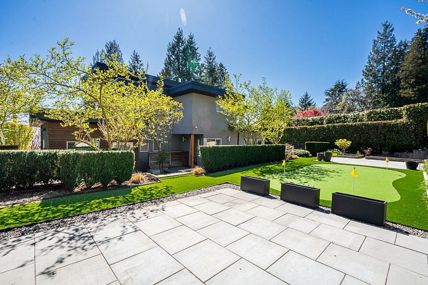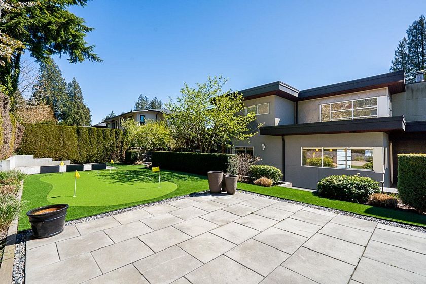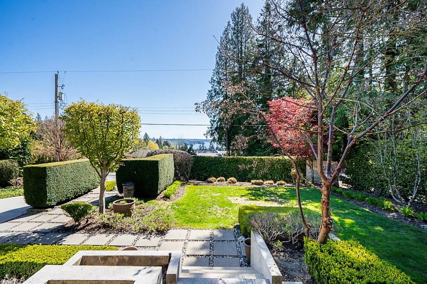 This contemporary Euro-style family home is nestled on a serene street in upper Ambleside & was completely rebuilt in 2008 using portion of foundation/framing of original 1955 home. Its large south-facing windows offer stunning water views of Stanley Park and downtown. Flooded with natural light, the home spans three levels featuring 5 bedrooms and 4 bathrooms, including a luxurious master suite with spa-like amenities. The lower level boasts a spacious rec room, media room, additional bedroom, and ample storage. An open kitchen and indoor-outdoor entertainment area with covered dining, firepit, putting green, two upper patios, and a built-in waterfall pond create the perfect setting for gatherings. Conveniently located near country clubs, shopping, and within walking distance to schools.