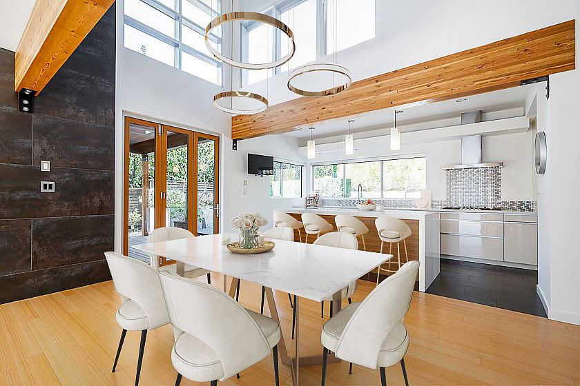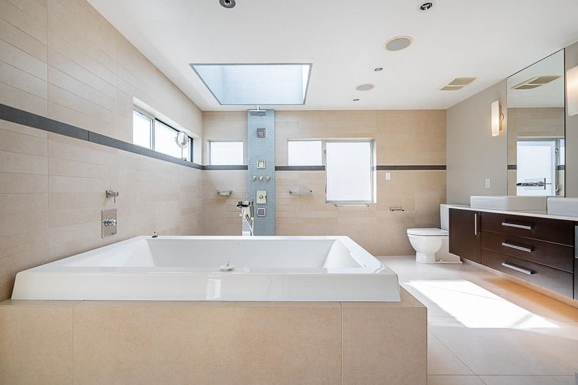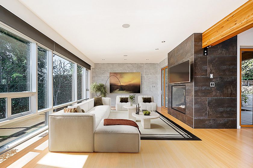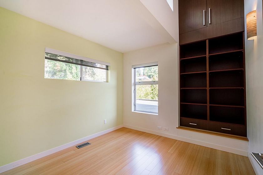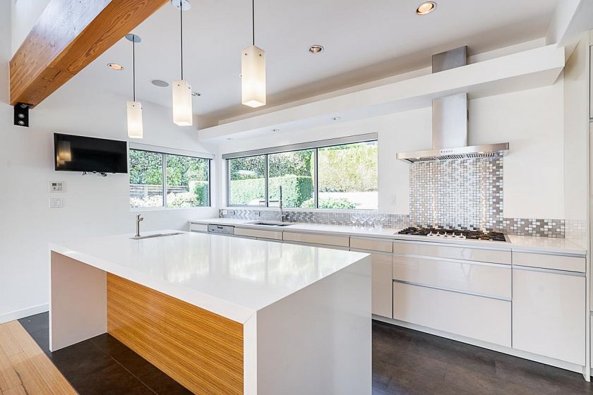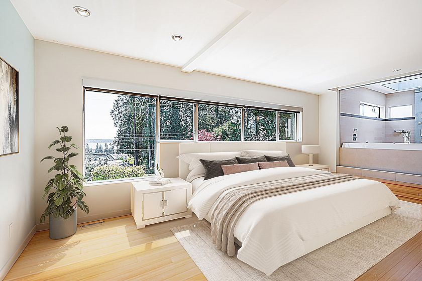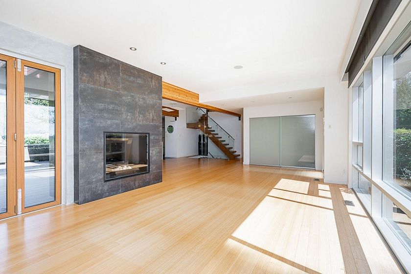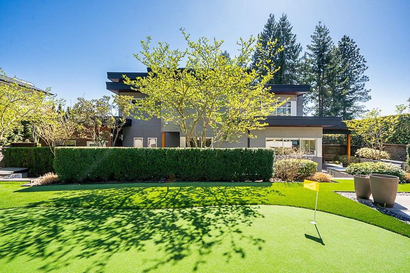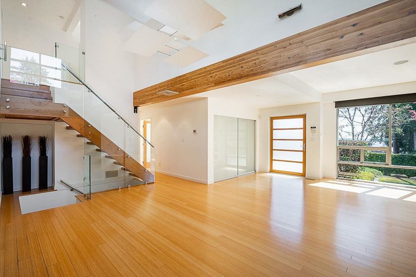 This contemporary Euro-style family home is nestled on a serene street in upper Ambleside & was completely rebuilt in 2008 using portion of foundation/framing of original 1955 home. Its large south-facing windows offer stunning water views of Stanley Park and downtown. Flooded with natural light, the home spans three levels featuring 5 bedrooms and 4 bathrooms, including a luxurious master suite with spa-like amenities. The lower level boasts a spacious rec room, media room, additional bedroom, and ample storage. An open kitchen and indoor-outdoor entertainment area with covered dining, firepit, putting green, two upper patios, and a built-in waterfall pond create the perfect setting for gatherings. Conveniently located near country clubs, shopping, and within walking distance to schools.