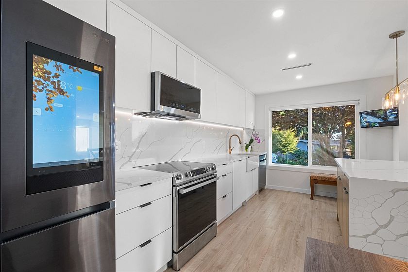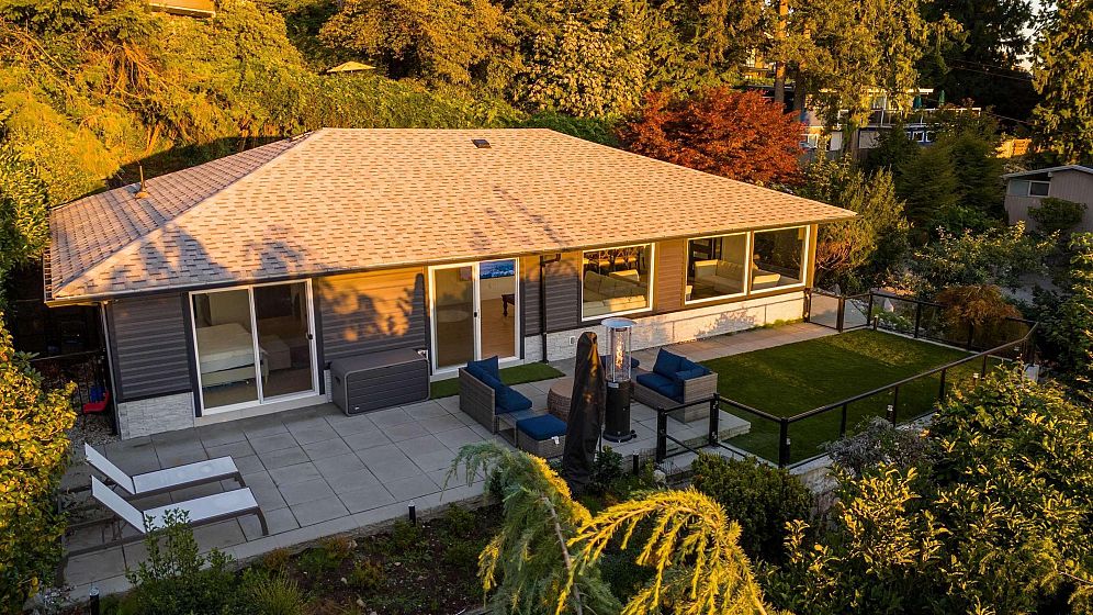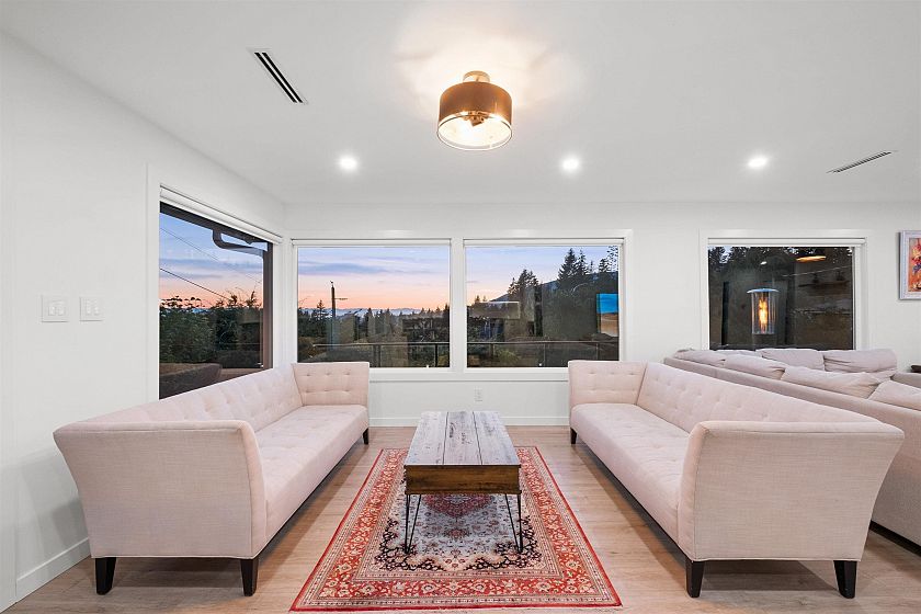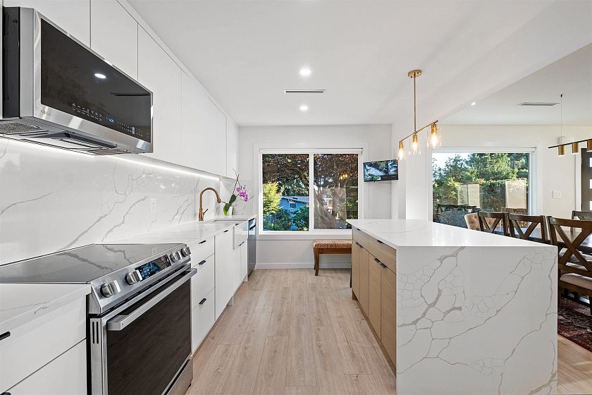 Fully renovated rancher has been fully updated in the past two years with permits, including new plumbing, wiring, and mechanical systems with Air - Conditioning. The home offers two bedrooms, a home office (den) and an enclosed one-car garage, all on one level. An open-concept layout takes advantage of the natural light and captures ocean and sunset views from its southwest corner position at Dalkeith Drive and West Balmoral Road. The nearly 8,000 sq. ft. lot includes landscaped front and back gardens for outdoor use. A practical option for downsizers or those looking for a move-in-ready home in North Vancouver. The neighbourhood is quiet, residential, and well-connected to the Lonsdale corridor.