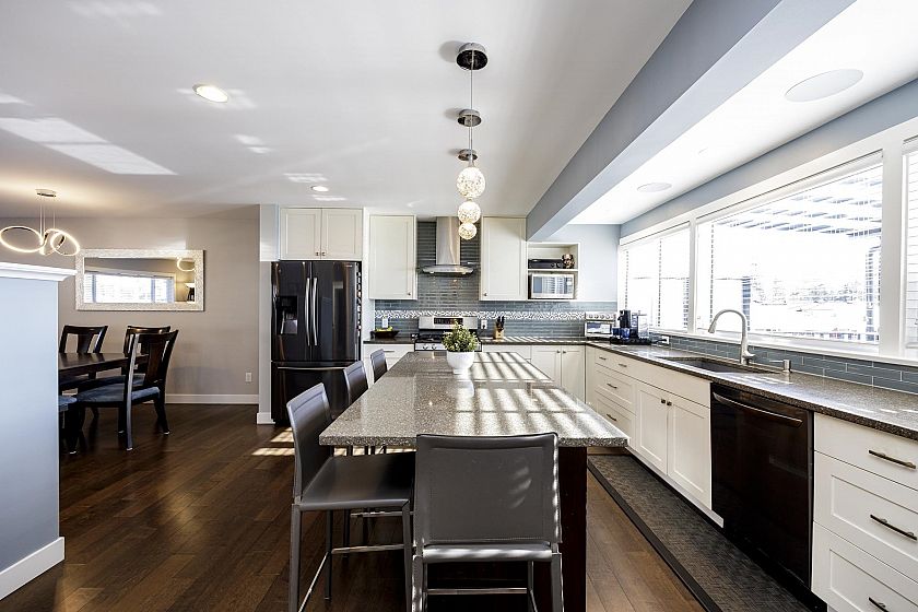This exquisitely renovated residence in sought after Grand Boulevard location offers 5 bedrooms, 3 baths and over 3,200sqft. The main floor boasts an open concept kitchen with stainless appliances, grand central island, ample cupboard & counter space plus access to a partially covered private deck. Gleaming hardwood floors enhance the spacious living room with stylish gas f/p and adjoining dining area - all ideal for entertaining. 3 beds & 2 baths on the main including a generous primary with ensuite, walk in closet and access to that private deck. Down is an extra bedroom, rec room and separate nanny space ensuring privacy and comfort for all. Set on a South-facing 50x147 fenced lot (perfect for pets & kids) in an enviable area. A true family haven!