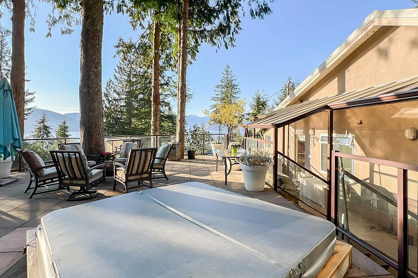 Welcome to Lions Bay featuring an incredible 4 bed 3 bath, 3,569 sf luxury entertainment beach home with PANORAMIC ocean views and westerly sunsets from the oversized deck w/ dual sided fireplace & hot tub. Step inside to an open layout w/ radiant in-floor heating, schonbek chandeliers, vaulted ceilings & windows, and skylights for ample natural light to the living area and chefs kitchen. French doors lead to the master bedroom w/ walk in shower, HUGE walk in closet and direct access to the sun drenched patio. Private 11,180 sf lot with a new metal roof, infrared sauna and strong rental income, this property has direct access to the Sea to Sky Highway. Short walk to transit, bistro, schools, world-class hiking, kayaking & beaches. Music community and home business bylaw friendly.