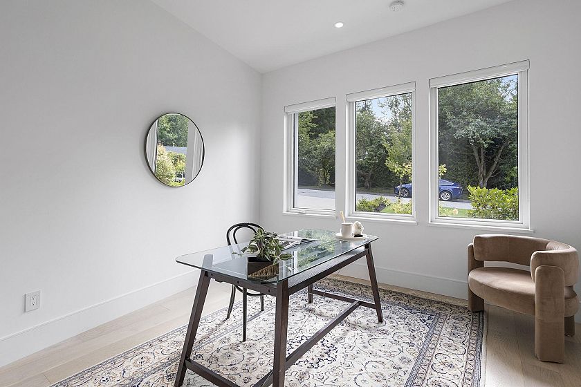 Welcome to this stunning and spacious contemporary home on a generous 10,241.861 SF flat lot, perfectly blending comfort, convenience, and lifestyle. Just a stone’s throw from Montroyal Elementary, a short walk to Handsworth Secondary and several high-quality daycare centers, and only a 2-minute drive to Grouse Mountain Ski Resort and countless trails, this residence offers a truly family-oriented setting surrounded by nature. With 4 bedrooms and 3 baths upstairs, plus a den with its own ensuite, there is always more space for family, guests, and a home office. The high-ceiling main floor fills the home with natural light, while custom high-end carpentry adds elegance throughout. A striking wood-and-glass staircase is complemented by the convenience of an elevator.