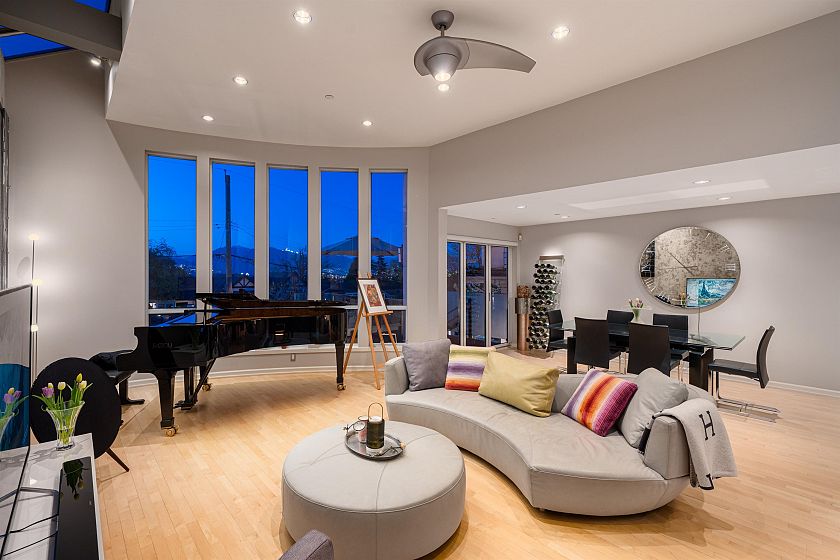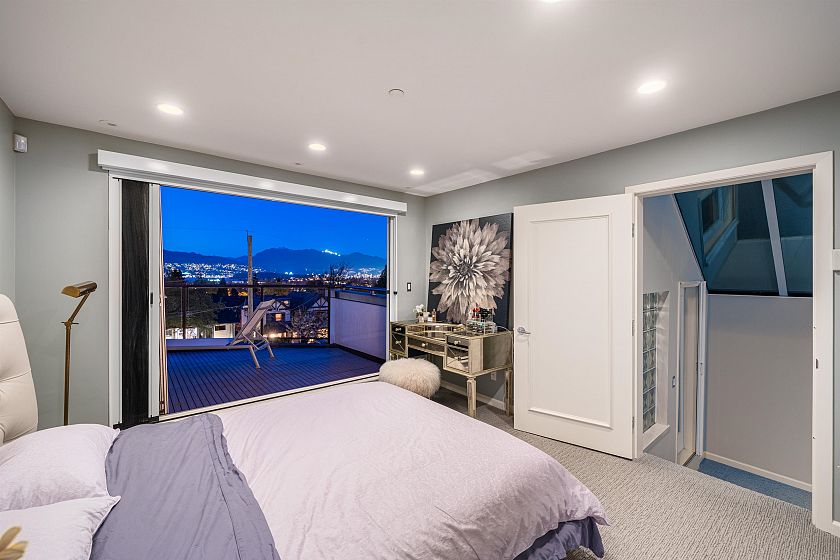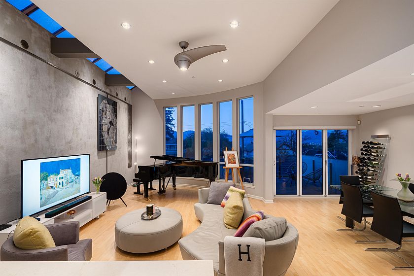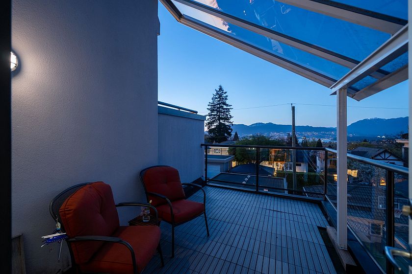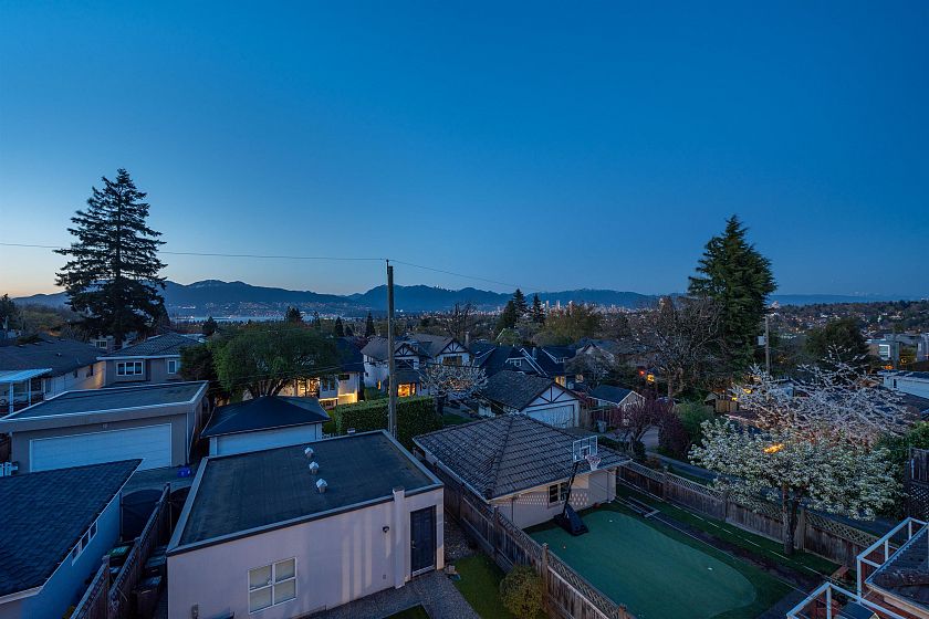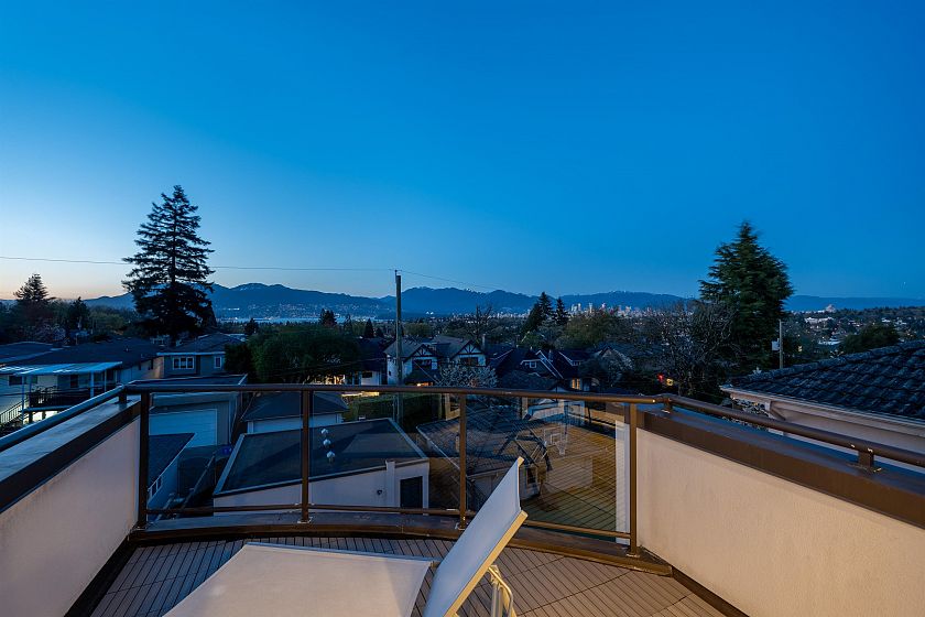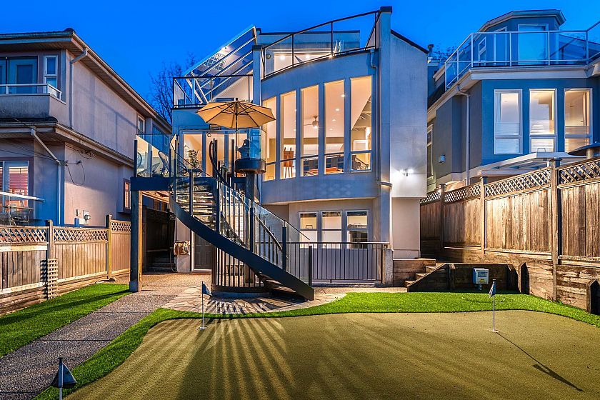 The Eagle's Nest. Behind the Japanese Zen garden entry stands the tallest house at the top of the hill, expansive views from all levels. 3 separate decks. Bright, airy and classy-modernist interior, lotsa skylights & sunshine. Better than new, tons of reno's in recent years. 5 level-split; Master + office up top, double height living/dining/gourmet kitchen/bbq deck, 2 more bdrms down, plus basement boasting a concrete soundproof movie studio/theatre. IBC boiler, and A/C, putting green in the backyard, storage system in the garage. Prince of Wales Secondary catchment; easy access to St. George's & UBC. Walking distance to family and pet friendly Balaclava Park.
