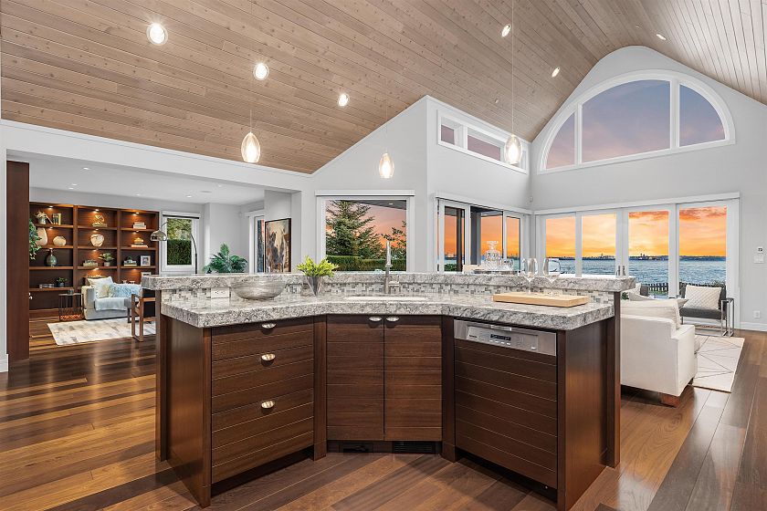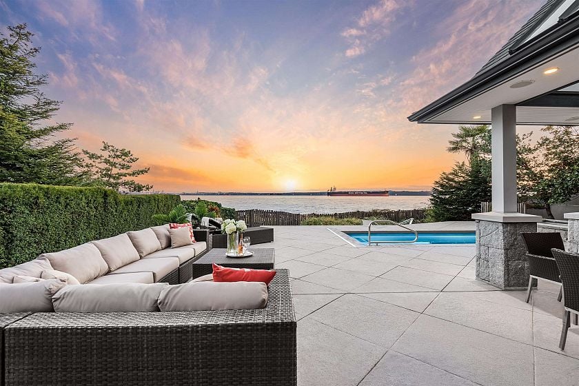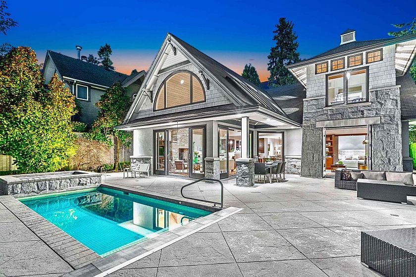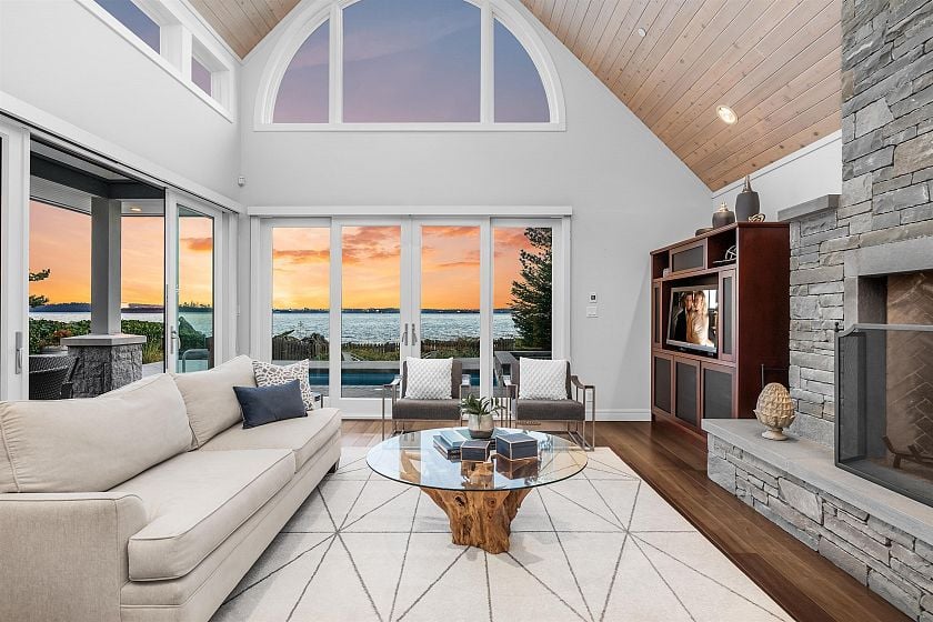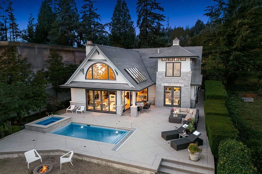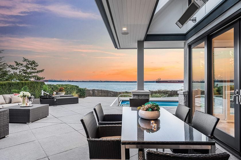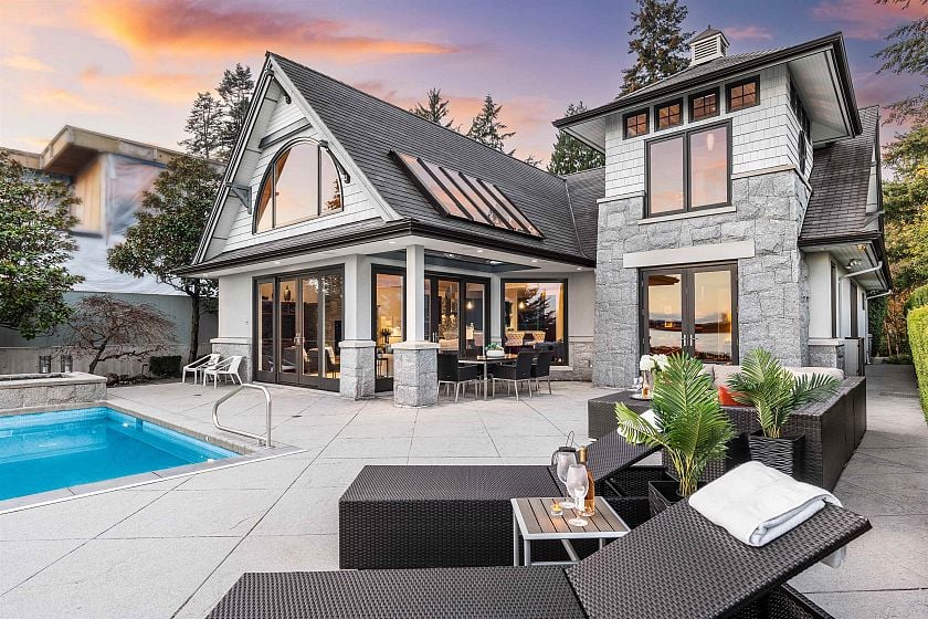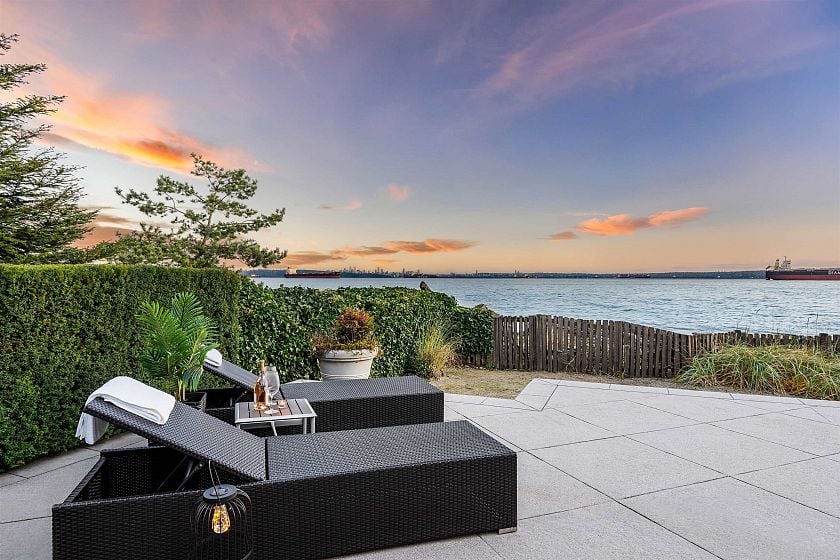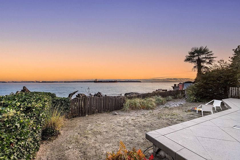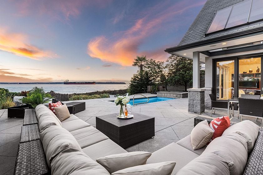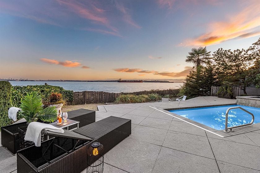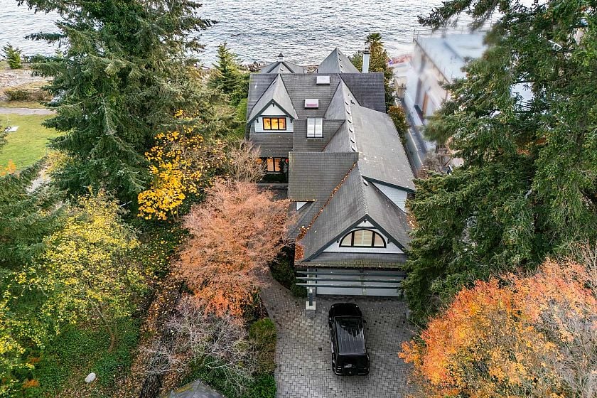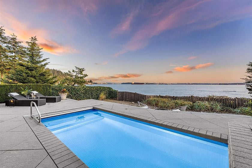 This magnificent beachfront residence is situated on a prized south facing property in West Vancouver’s sought after Lower Caulfield neighborhood. The architectural elegance with its beautiful exterior and impeccable landscape provides almost five thousand square feet of formal and informal living on two spacious levels. Enter into an impressive reception hall leading to entertainment size principal rooms, a private study, large gourmet kitchen with adjoining spice kitchen, daily eating area and generous family room providing a wonderful indoor outdoor lifestyle with direct walk-out access to a private view-side terrace, poolside entertainment area, fabulous heated swimming pool and level beach access. Additional features include air con, a private guest / nanny area and attached garage.