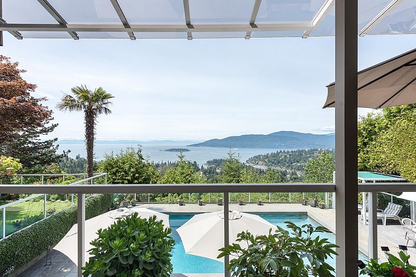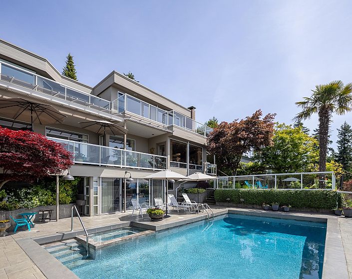 Situated in prestigious Cypress Park Estates, this custom-built one-owner home blends contemporary comfort with stunning ocean views. Expansive living and dining areas, an updated gourmet kitchen, and a family room open to covered decks and landscaped gardens—all overlooking the sparkling pool and sweeping westerly ocean views. The main level also offers a private office and guest suite, while upstairs features five bedrooms with decks, including a luxurious primary with spa-like ensuite. A spacious rec room on the lower level flows directly to the pool and hot tub, creating an ideal setting for family living and entertaining. With a level driveway, oversized double garage, and close proximity to top schools, Caulfeild Village, and quick highway access, this residence truly has it all.