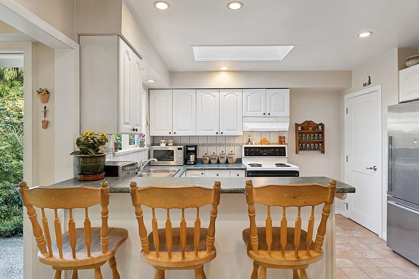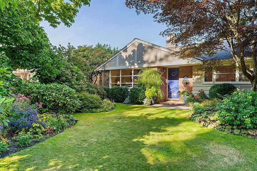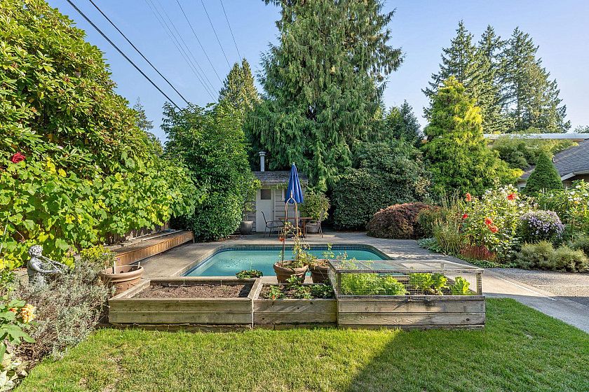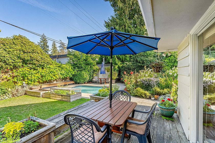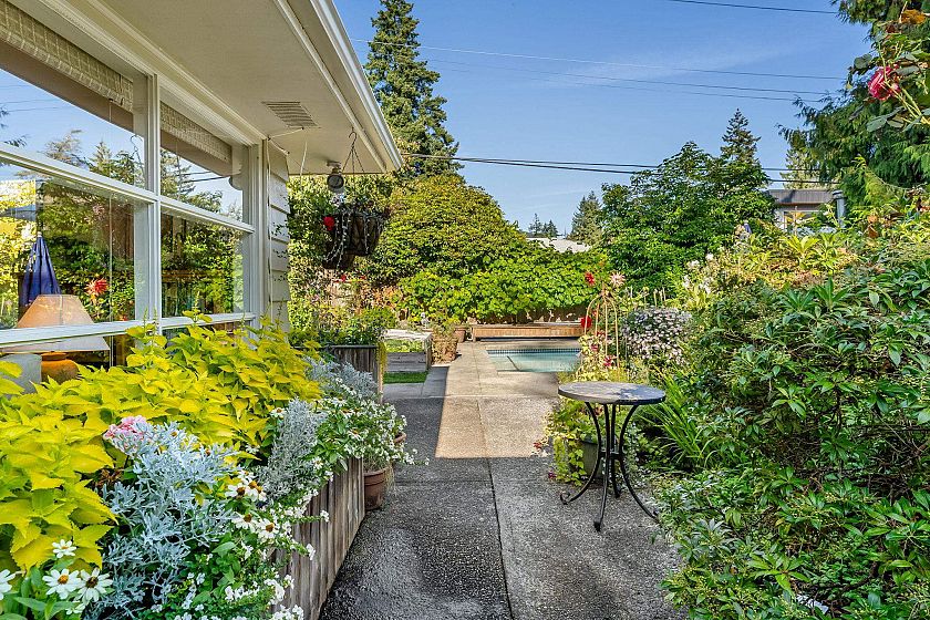 Surrounded by lush gardens, this 3 BED, 2 BATH is a private SANCTUARY on its 70x115 level lot. Maintained by master gardeners, the grounds unfold into enchanting spaces—flowering pathways, quiet nooks & a sparkling pool for summer dips & afternoon cocktails. With over 1,700 SF of single-floor living, the interior features an efficient layout, large windows & a skylight that casts a gentle glow throughout. Sunlit kitchen w/a coffee bar nook leads to a family room & deck, perfect for families & gatherings. HW flrs, 2 fireplaces & LOVINGLY MAINTAINED thru the years inc. updated bedrms & baths adding timeless warmth. This is a home where every season paints a new scene. Easy stroll to charming Edgemont Vlg, Delbrook Ctr, Highland Elem, trails & quick drive to Handsworth Sec.