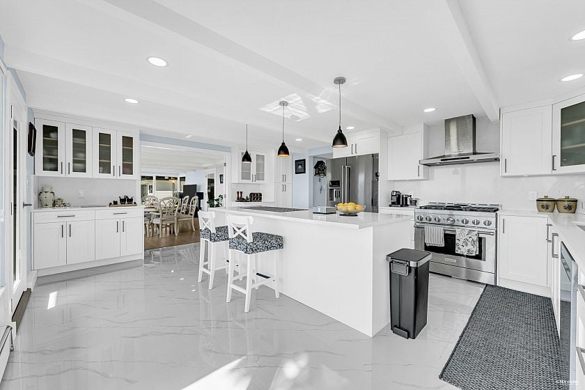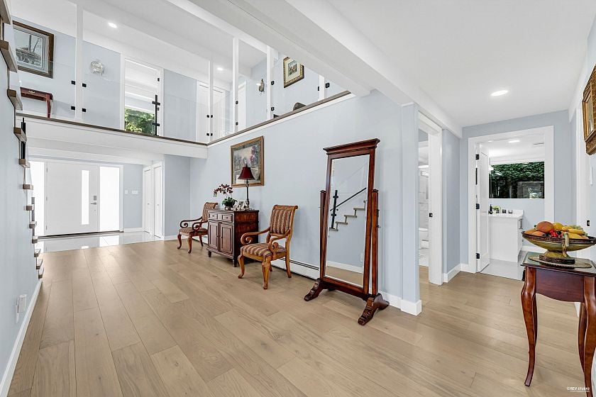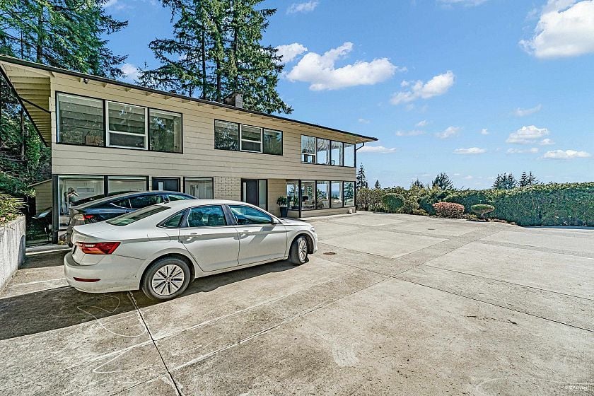 Experience breathtaking panoramic ocean and city views from this private estate, perfectly situated at the end of a quiet cul-de-sac. This completely renovated, custom built Lewis Post & Beam home is designed to maximize natural light with expansive windows on both levels framing unobstructed views. The main level features a grand formal living and dining room, kitchen, spacious recreation room, and executive style office. Upstairs boasts an exceptionally large family room and four well proportioned bedrooms for ideal family living. A private entry space with full kitchen offers potential as a self contained studio, while a fully separate one bedroom suite serves as a valuable mortgage helper. Plenty of parkings. Close to prestigious Collingwood School.