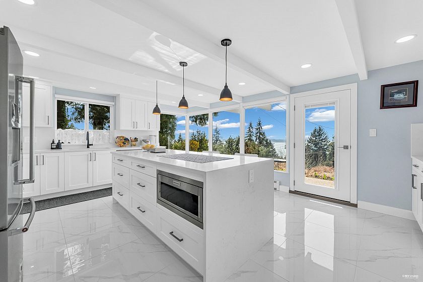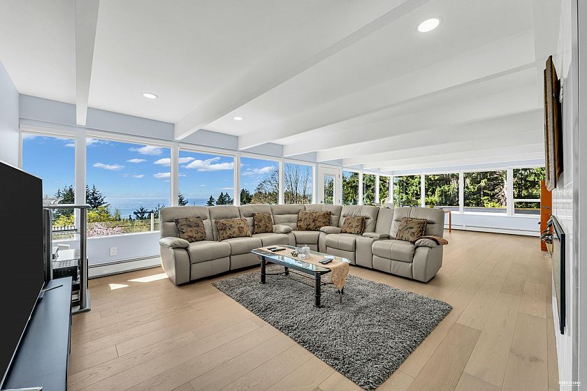 Experience breathtaking panoramic ocean and city views from this private estate, perfectly situated at the end of a quiet cul-de-sac. This completely renovated, custom built Lewis Post & Beam home is designed to maximize natural light with expansive windows on both levels framing unobstructed views. The main level features a grand formal living and dining room, kitchen, spacious recreation room, and executive style office. Upstairs boasts an exceptionally large family room and four well proportioned bedrooms for ideal family living. A private entry space with full kitchen offers potential as a self contained studio, while a fully separate one bedroom suite serves as a valuable mortgage helper. Plenty of parkings. Close to prestigious Collingwood School.