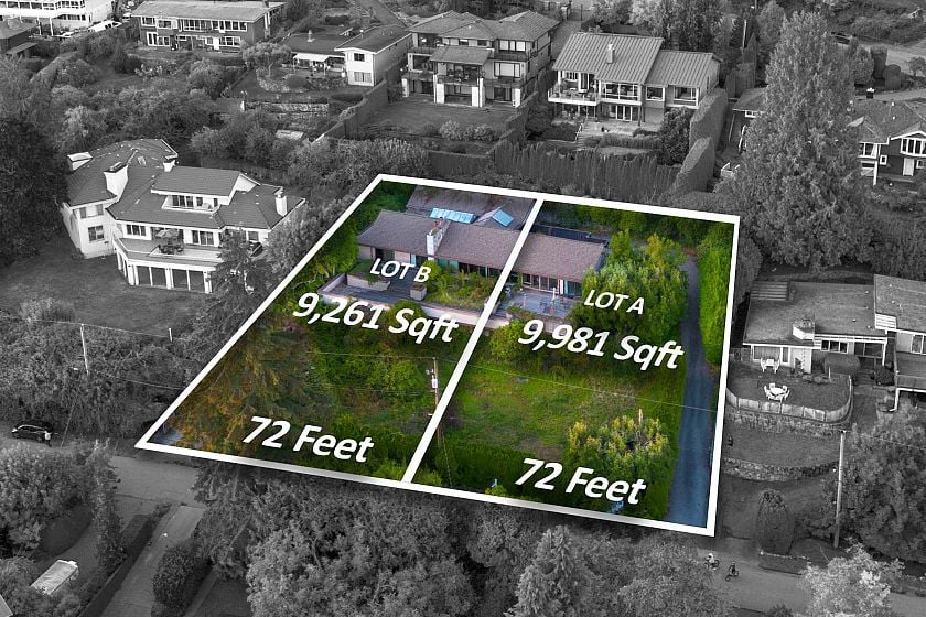 Build your dream home today. RARE OPPORTUNITY in Upper Dundarave! Subdivided 19,244 sq.ft. premium lot with 144 ft frontage and panoramic views of the Lions Gate Bridge, ocean, city & Mt. Baker all from the main floor. Over three years of planning, design & approvals completed. Fully rezoned & ready to build one mansion or two luxury homes. Lot A: 9,981 sq.ft. / 5,427 sq.ft. home (incl. coach house). Lot B: 9,261 sq.ft. / 4,983 sq.ft. home (incl. coach house). Minutes to Mulgrave & Collingwood Schools. Ideal for builders, architects or families creating a dream home with world-class views.