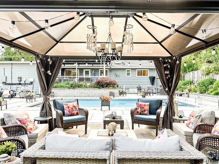 Beautifully maintained bungalow-style residence offers approx 1718 SF of refined, single-level living. Timeless charm & modern updates. Skylit corridors bathe interiors in natural light. Spacious principal rms incl formal living & dining, striking stone FP & oversized windows capture garden views. Custom kitchen, functional & inviting, classic heritage-style cabinets, bright white appliances, engineered HW flrs & casual eating area. 3 generous bedrms incl lovely primary suite w/ensuite. Lower offers rec/play space or lounge area for growing families. Outside is private, sun-soaked oasis, covered patios & sparkling pool w/automated protective cover. Mins to scenic hiking trails, Parkgate Village, community amenities & top-rated schools. Rare offering combining value, lifestyle & location.