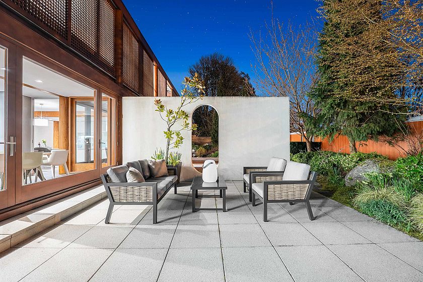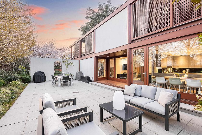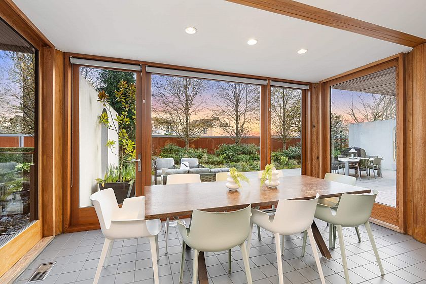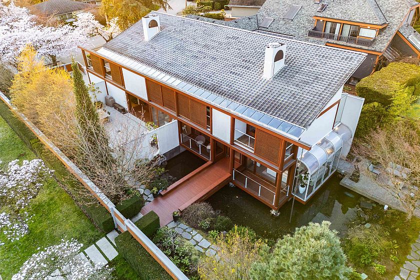 An architectural masterpiece designed by the late, renowned architect Arthur Erickson, this residence is situated on a 10,536 sq.ft. lot and features an exquisite Koi Pond Sanctuary Garden. Expansive floor-to-ceiling windows flood the interior with natural light, creating a serene and open atmosphere while blurring the line between indoor and outdoor living. The principal living areas are thoughtfully designed to frame spectacular garden views, offering a breathtaking backdrop and an unparalleled sense of tranquility. A sunlit hallway leads to four generously sized bedrooms, luxurious bathrooms, and a well-appointed laundry area on the upper level. The lower level offers a spacious playroom, complemented by an impressive wine cellar perfect for entertaining in style.
