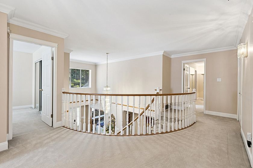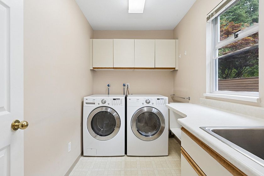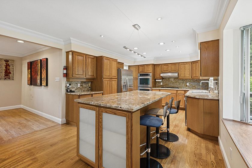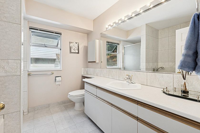 Spacious 4-bed, 4-bath Grouse Woods home with over 4,200 sq/ft across three levels, including a large basement with suite potential. A grand foyer with soaring ceilings and curved staircase opens to bright, generous rooms. The living room features a bay window and gas fireplace, while the dining room suits family gatherings. At the back, an open kitchen with oak cabinets, stone counters, stainless appliances, and large island flows to an eating area and family room with access to a private west-facing deck. Upstairs: 4 bedrooms, including a primary with walk-in closet and 5-piece ensuite. The lower level offers a rec room, wet bar, bath, and flex areas with separate entrances. Walk to Grouse Mountain, Grouse Grind, and trails. In Montroyal Elementary and Handsworth Secondary catchments.