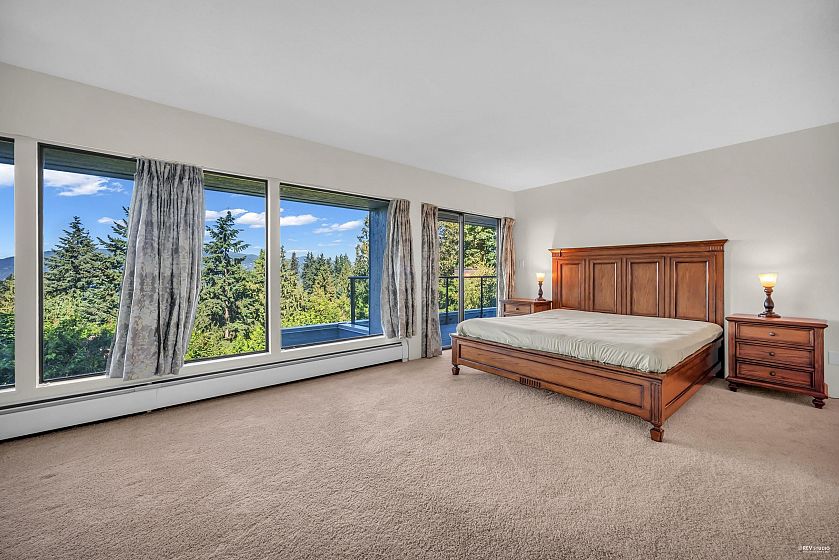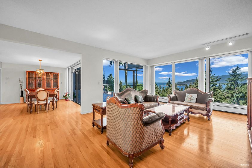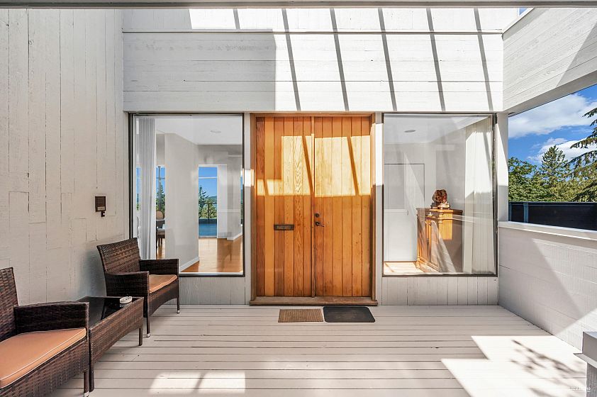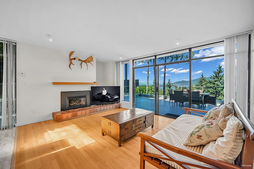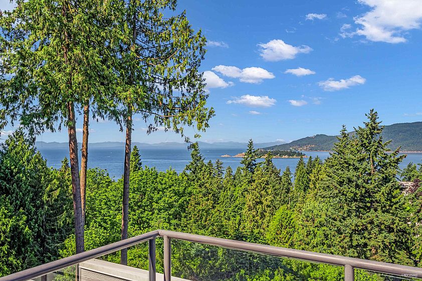 Enjoy stunning views of Howe Sound from this contemporary three-level home, designed by the renowned Arthur Erickson and tucked away on a quiet cul-de-sac. Soaring floor-to-ceiling windows fill the interiors with natural light and showcase the surrounding beauty. The main level features spacious living and family rooms that open onto a large deck, perfect for entertaining. Upstairs, the generously sized primary suite offers a 5-piece ensuite and its own private deck. The lower level includes a second primary suite with fireplace, 5 piece ensuite, and deck access, plus two additional bedrooms. Beautifully maintained and partially renovated in 2025, this home is a quintessential example of West Coast living, combining trees, views, and privacy in perfect harmony.