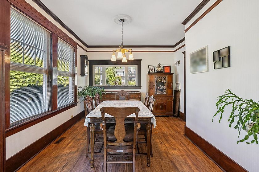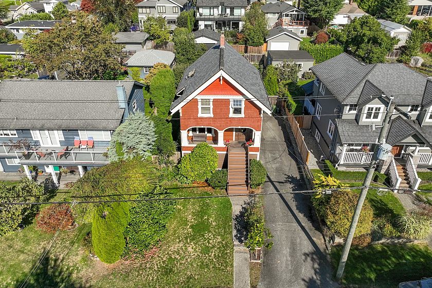 The Historic “Burgess House” - Offered for the first time in 30 years, this cherished 1912 Craftsman home blends timeless character with thoughtful updates. Recognized with a 2017 heritage preservation award, it features 9’ ceilings, stained-glass windows, and intricate millwork. The south-facing living room with gas fireplace connects to a formal dining area, while the spacious kitchen opens to a deck and level backyard. Upstairs offers four bedrooms with mountain and partial city views, and the lower level includes a near-new one-bedroom guest suite. Set on a 50’ x 132’ lot with lane access for future garage or coach house potential (confirm with DNV), and steps to École André-Piolat and Braemar Elementary—this is a rare chance to own a piece of North Vancouver’s history.