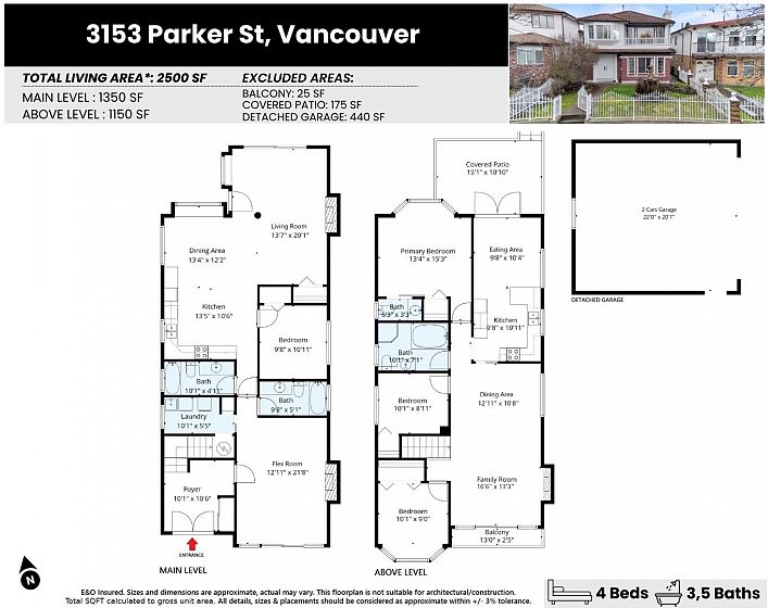 A well-maintained Vancouver Special. The upper level offers quality hardwood flooring, crown mouldings, and a finished painted ceiling. The spacious gourmet kitchen includes granite countertops, oak cabinetry, and a large dining area with French doors opening to a covered sun deck perfect for year-round enjoyment. The walk-out main floor includes a legal one-bedroom suite (w/ potential for two bedrooms), a generous recreation room, and two full bathrooms. Situated on a deep 33 x 146.12 ft lot with mountain views from the upper floor and potential for a laneway home above the garage. Conveniently located to transit, Dr. A.R. Lord Elementary, Templeton Secondary, Notre Dame Secondary, local shops, T&T Supermarket, and with easy access to the SkyTrain along Renfrew St.