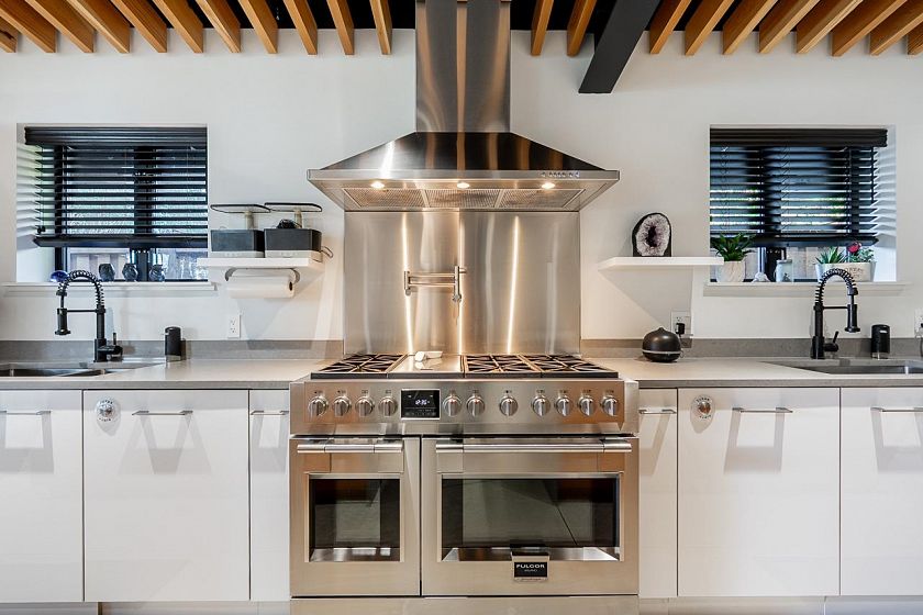 Award-winning contemporary home backing onto a private forested greenbelt. 2021 Georgie Award finalist, this 5,400+ sq. ft. quality custom residence (2019) features striking steel, glass, and concrete design with a sleek black exterior. Open-concept main floor with soaring ceilings, floor-to-ceiling windows, and statement island fireplace flows to the covered patio and expansive terrace. 700 sq. ft. chef’s kitchen with dual islands and premium appliances direct access to large, beautifully landscaped property. Lower level offers three en-suite bedrooms, large media/games room with kitchenette, and home theatre. Radiant concrete floors, home office, gym space, and ample parking. Quiet setting just 15 minutes to downtown via Ironworkers Bridge. A truly rare opportunity.