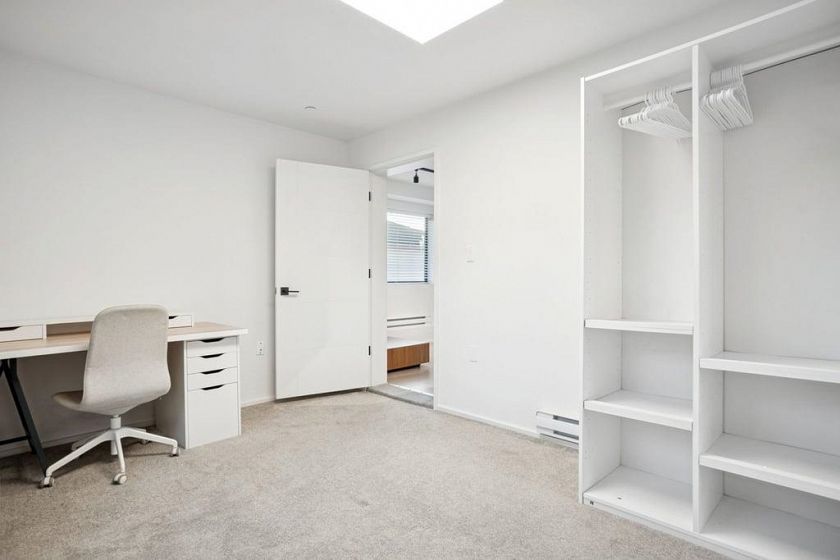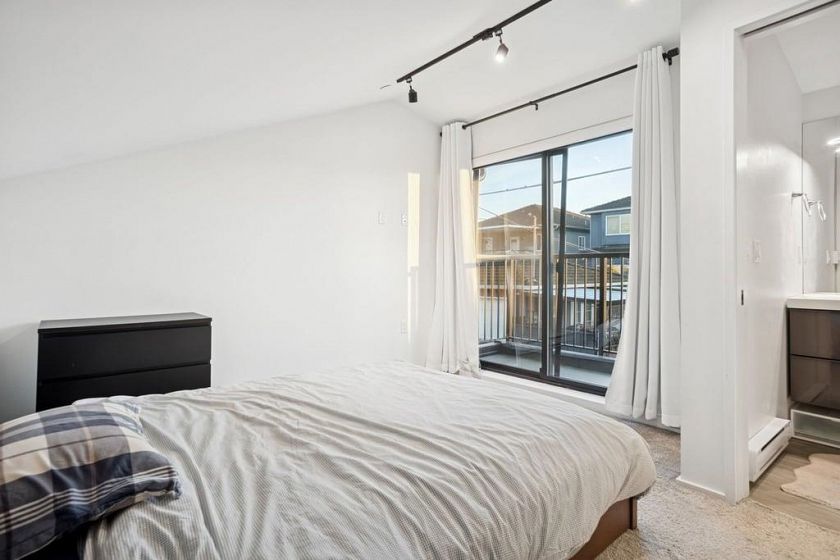 This 586sf, 2 levels, 2 bedrooms, 1 bathroom laneway house has plenty of sunshine with open southern exposure. The foyer, kitchen and living room has light fir laminate floors. The kitchen has one row of veneer cabinets, engineered stone countertops, ceiling track lights, stainless steel appliances and a rectangular under-mount steel sink. Under the staircase are two storage spaces and the laundry set. The living room has a huge window and ceiling track lights. The 2nd bedroom on this floor also has a large window. Upstairs is the primary bedroom with a balcony and 4 pcs ensuite bathroom featuring a soaker tub w/ shower and a sleek vanity with a bold rectangle one piece sink counter. Rent includes electricity. The owners are a local family who lives in the main house.