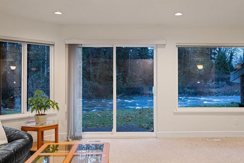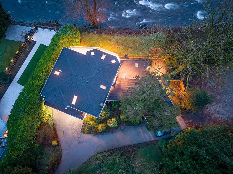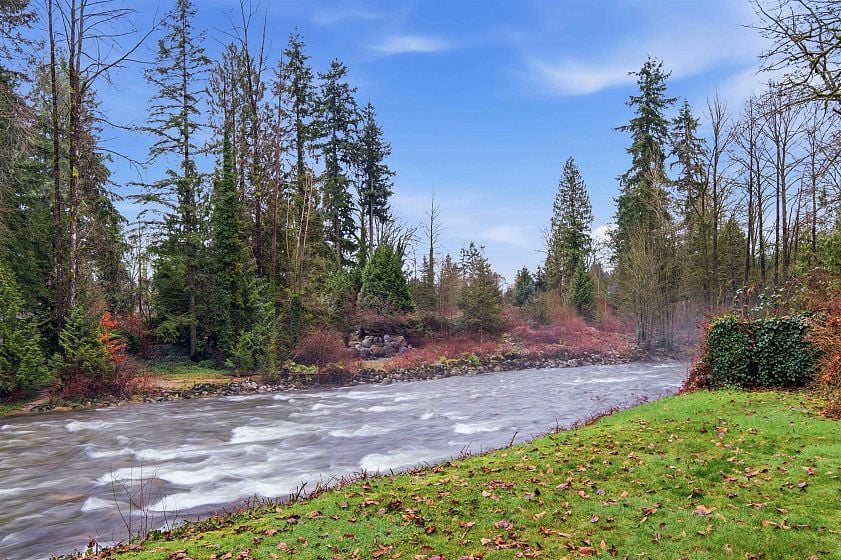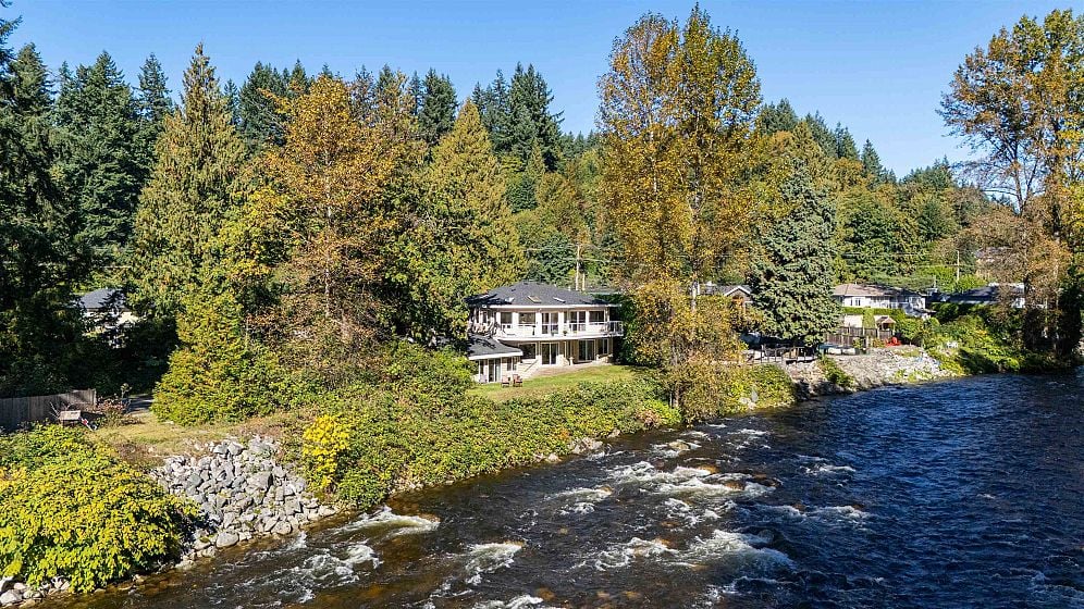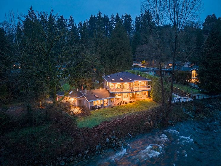 One-of-a-kind riverfront estate on a nearly 23,000 sq ft lot with rare frontage on the Seymour River. This exceptional property offers unmatched privacy, space, and natural beauty in a truly park-like setting. The two-level home is designed to capture the views with sun-drenched living areas, expansive windows, and multiple decks and patios for seamless indoor-outdoor living. A long private driveway winds through manicured grounds to this secluded riverside retreat—perfect for families, entertaining, and everyday escape. Bonus: a self-contained 2-bedroom above-ground suite with its own garage, ideal for in-laws or rental income. Potential for subdivision or a future coach house. Rarely do properties of this scale and setting come to market, this property is a true North Shore treasure.