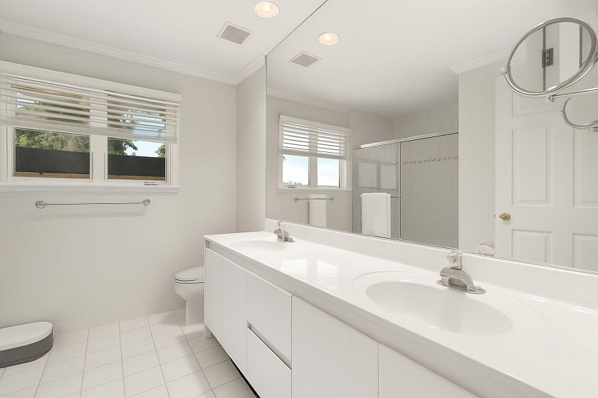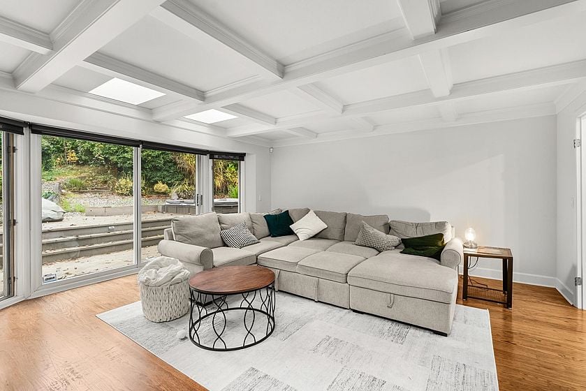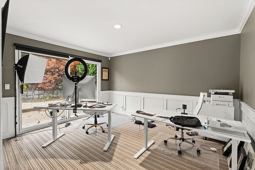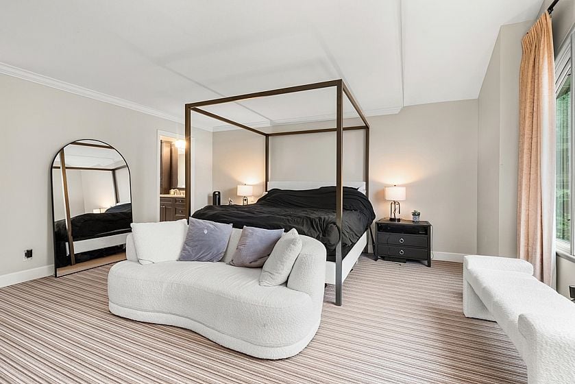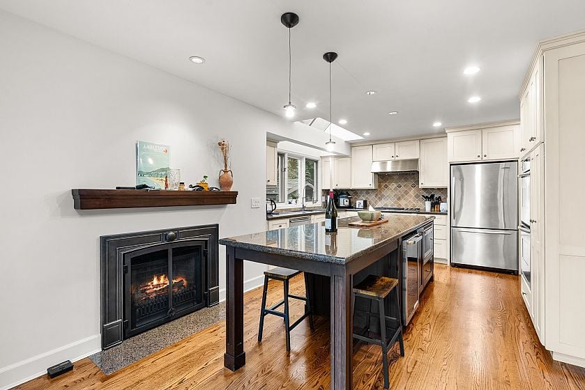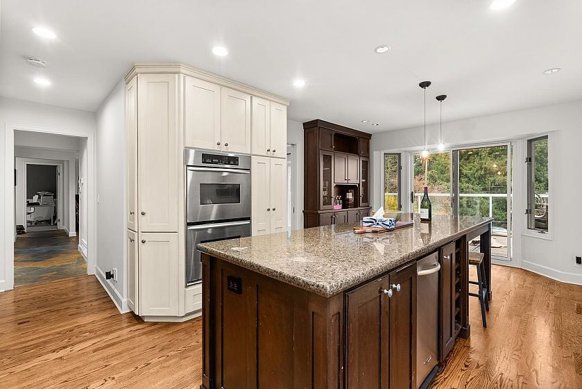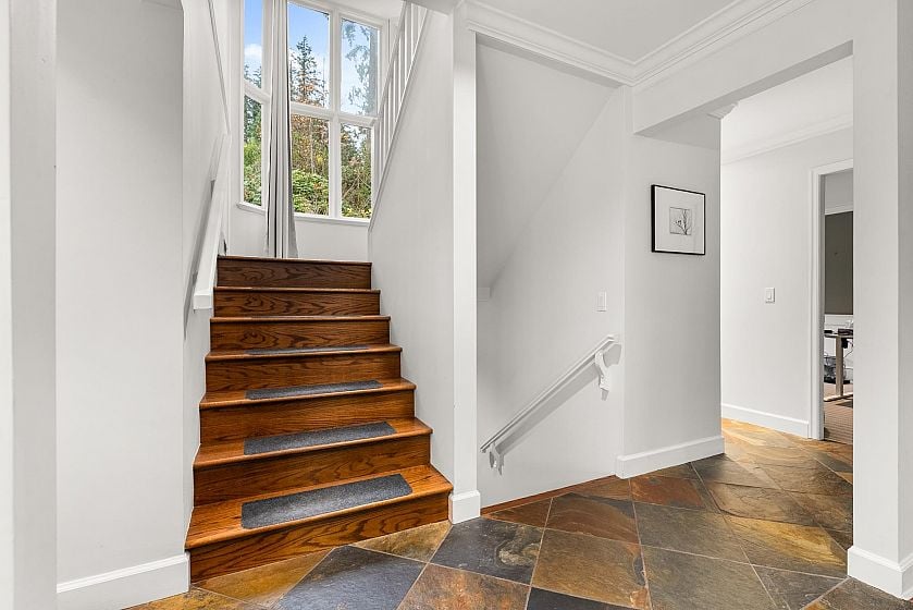 Exceptional family home, tastefully renovated in 2006, offering approx. 3,500 sqft across three levels. The traditional layout includes 4 well-appointed bedrooms upstairs, highlighted by a luxurious primary suite with a walk-in closet and elegant ensuite. Main level features a welcoming foyer, formal living and dining rooms with large windows, rich hardwood and slate flooring, a gourmet island kitchen with breakfast bar, adjoining eating area, family room with coffered ceilings, fireplace and media centre, plus a private office, rec room, and oversized double garage. French doors lead to a beautifully landscaped 1/3 acre with serene patios and lush gardens. Walk to West Bay School, McKechnie Park, and Dundarave.