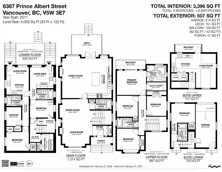 Quality 2011-built home with strong income potential, offering two legal suites plus a laneway home. The main residence features 11’ ceilings, engineered hardwood floors, radiant heating, and two gas fireplaces. Open living and dining areas with built-in storage connect to a well-appointed kitchen and den with large peninsula island stainless steel appliances, plus west-facing deck offers brilliant afternoon light. Second floor includes rare 4 bedrooms, including a primary with walk-in closet, ensuite, and private west-facing deck. Single-car garage. Steps to Memorial South Park and the shops, dining, and energy of thriving Fraser Street.