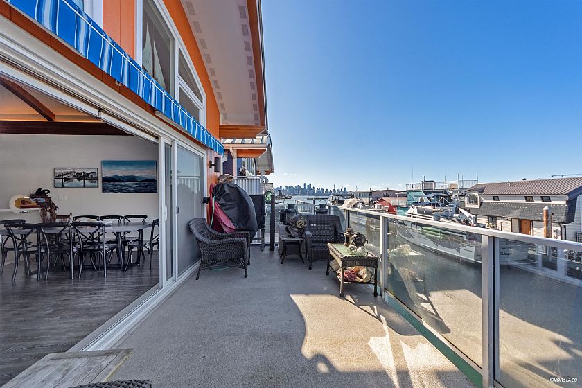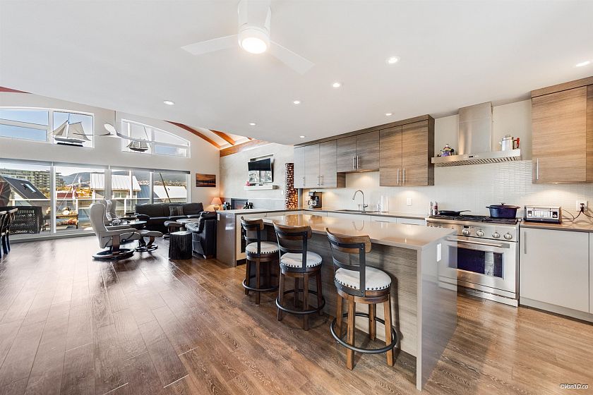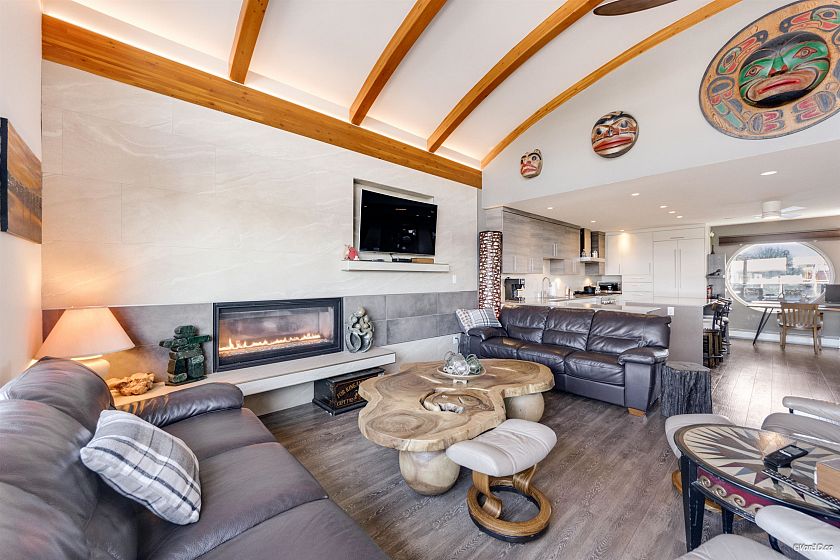 THIS FIRST CLASS FLOAT HOME SITS NEXT TO SPIRIT TRAIL, LONSDALE QUAY, SEABUS, LOWER LONSDALE SHOPS & SERVICES, MAGAZINE WORTHY COMMUNITY! Experience being on the Ocean & enjoy magical sunsets, mtn views & a lifestyle with no yard upkeep, just lock and go! Inside is dreamy with reverse floorplan, 3 full bedrooms down and spacious open concept upper floor. Massive kitchen adorned with granite ctr tops, high end appliances & huge " Gathering Island". The living & dining rooms are huge, vaulted ceilings with crown mould accent lighting, a beautiful linear gas fireplace to cozy up by while enjoying water views from every room. Home is ready for AIRBNB with small annual feel. This lifestyle is fantastic for full or part time living. Truly is a special place.
