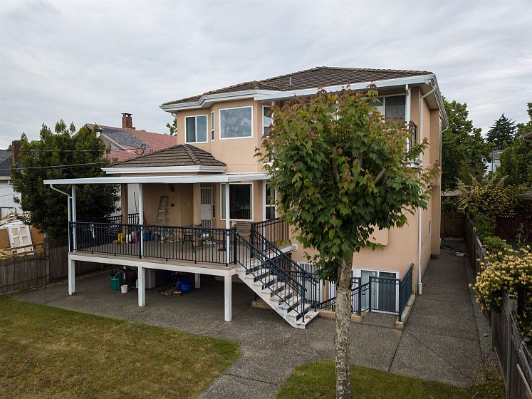 Prestigious Fraserview estate with panoramic views on a rare 7,050 SQFT flat lot. This impressive 3-level executive home offers grand scale, timeless craftsmanship, and exceptional comfort. Grand open entry with Roman pillars, expansive living areas, 9’ ceilings on main, and a large covered deck overlooking the private yard. Generous media and recreation rooms make entertaining easy. Upstairs, each bedroom features its own ensuite, including a spacious primary with jacuzzi tub and steam shower. A/C, built-in vacuum, sauna, alarm, wet bar, and in-floor heating throughout. Steps to Oppenheimer Elementary, transit and minutes to Fraserview Golf Course.