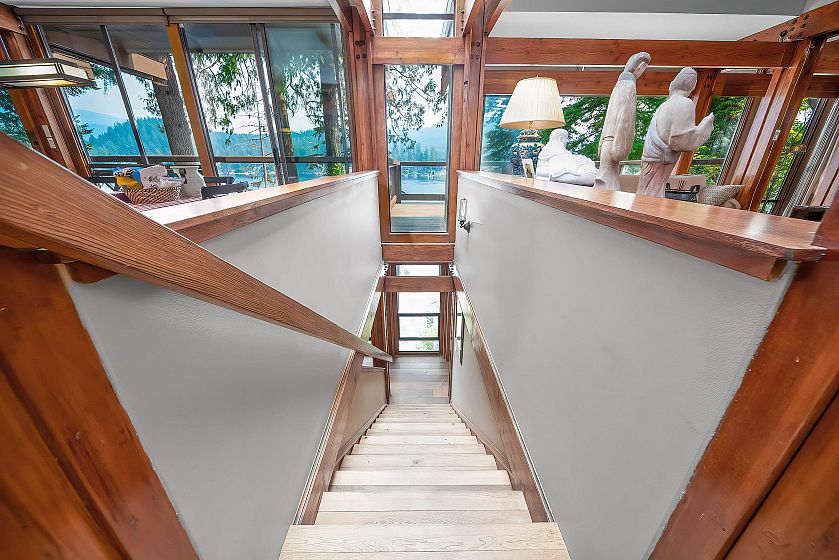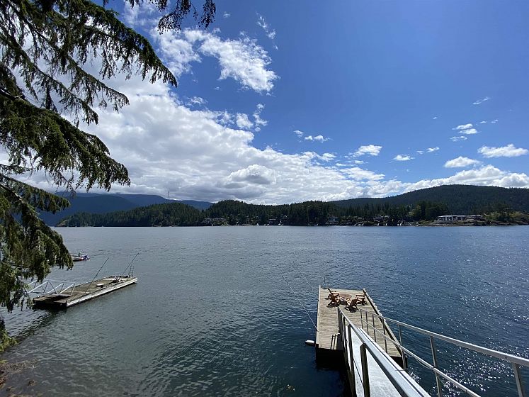 Deep Cove Waterfront with Irreplaceable private boat Dock! Architect-designed by Paul Merrick, this stunning contemporary home sits on a private cul-de-sac along the Deep Cove shoreline with breathtaking ocean views. Floor-to-ceiling windows bring natural light and panoramic water views into each room. Fully updated in 2013 with full kitchen , Sub-Zero fridge, Miele appliances, piples, energy-saving heating system, and White Oak flooring throughout, Over 1,650 sqft of decks surround the living, kitchen, dining — perfect for entertaining. The spacious primary suite features its own large and covered deck ideal for yoga or workouts. The sitting room that can serve as a 4th bedroom or office. Level driveway with single garage and double carport. Lifestyle PLUS!