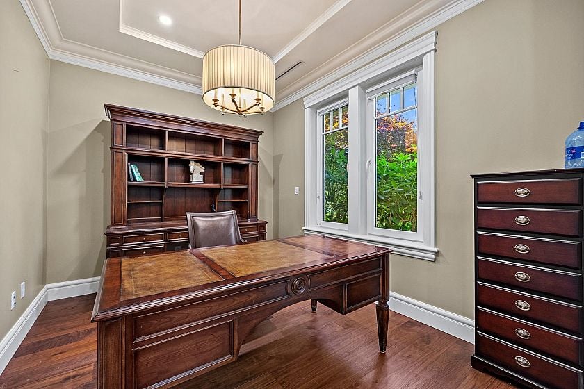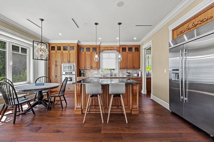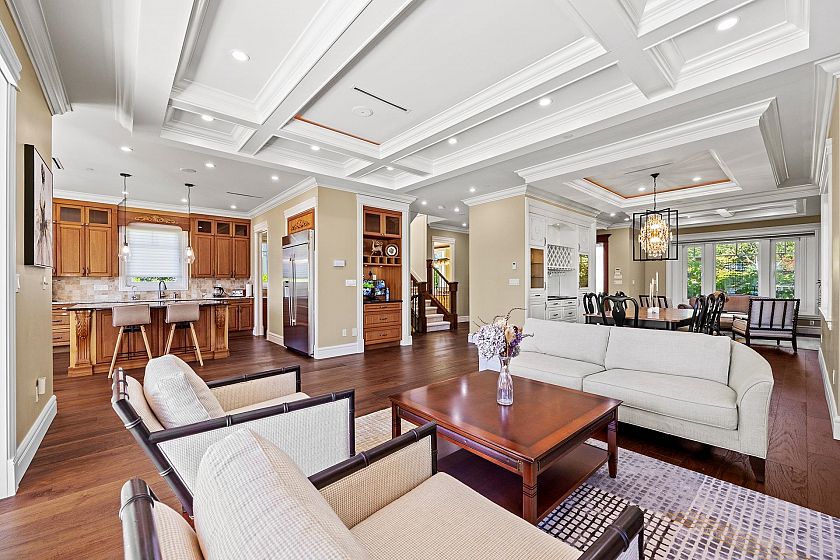 Situated on a 6,500 sqft. lot, this stunning custom-built residence offers over 4,737 sqft. of thoughtfully designed living space. Boasting views of both water and mountains, this south-north facing home is bathed in natural light and showcases premium materials and craftsmanship throughout. The main level features soaring 10-ft ceilings, a grand formal entry, and a functional layout including a office,living and dining rooms, a deluxe Western kitchen, a fully equipped wok kitchen, and a sunny breakfast nook. The spacious family room opens directly onto a beautifully landscaped backyard with a covered patio. Three generously sized ensuite bedrooms up, with vaulted ceilings over 11 feet. The lower level is elevated and nearly above ground, providing excellent natural light and full function