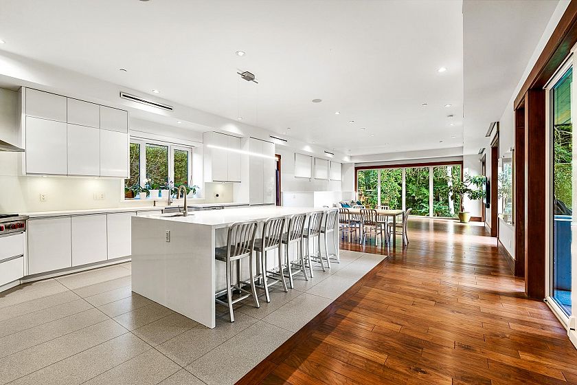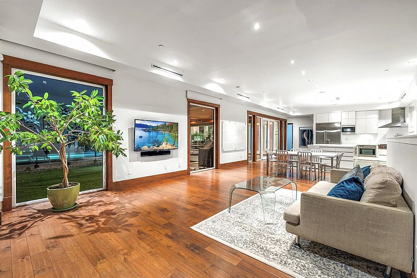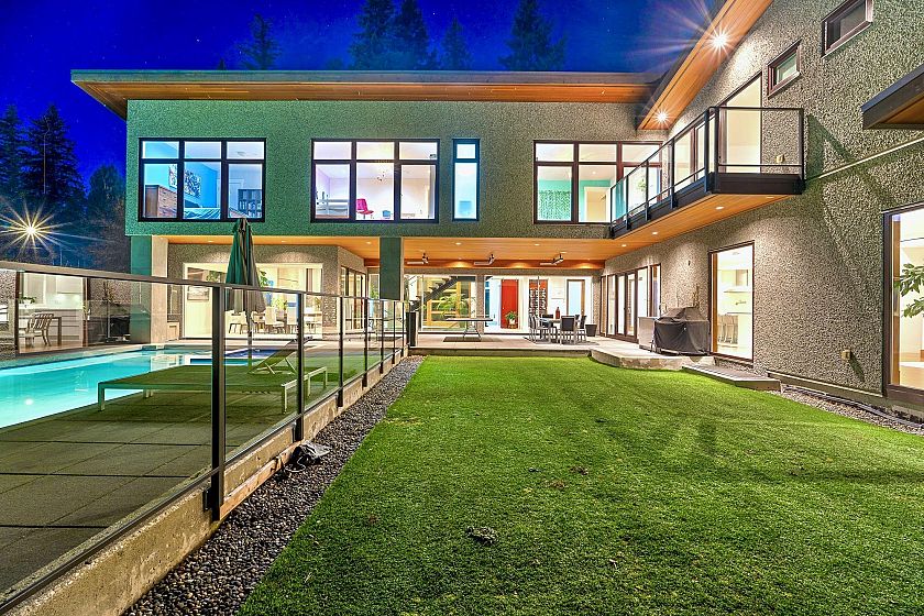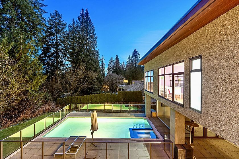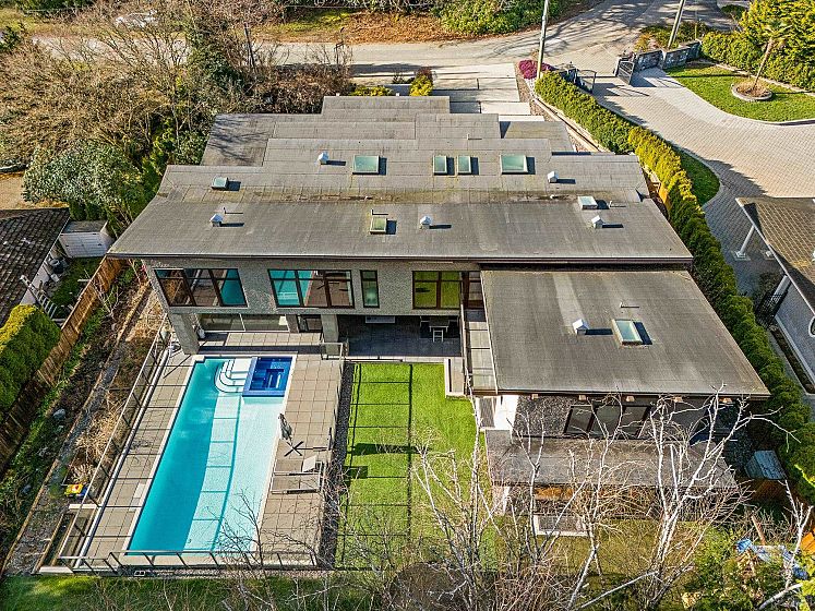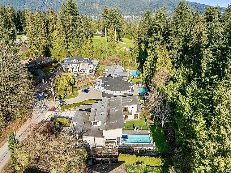 Spectacular contemporary estate on the 10th fairway of Capilano Golf & Country Club, offering exceptional scale and resort-style living. Designed by Rommel Designs, this 7,419 sq.ft. residence spans three levels on a private 13,504 sq.ft. lot in the Lower British Properties. Features include a dramatic atrium living room with soaring ceilings, formal dining, and a sleek European kitchen with premium appliances, large island, and adjoining family room. Seamless indoor-outdoor living with covered heated terraces, BBQ centre, pool, and spa. Upper level offers a luxurious primary suite plus 3 ensuited bedrooms. Lower level with rec room, 3 bedrooms, and flexible space. Prime location near top schools, golf, and Park Royal.