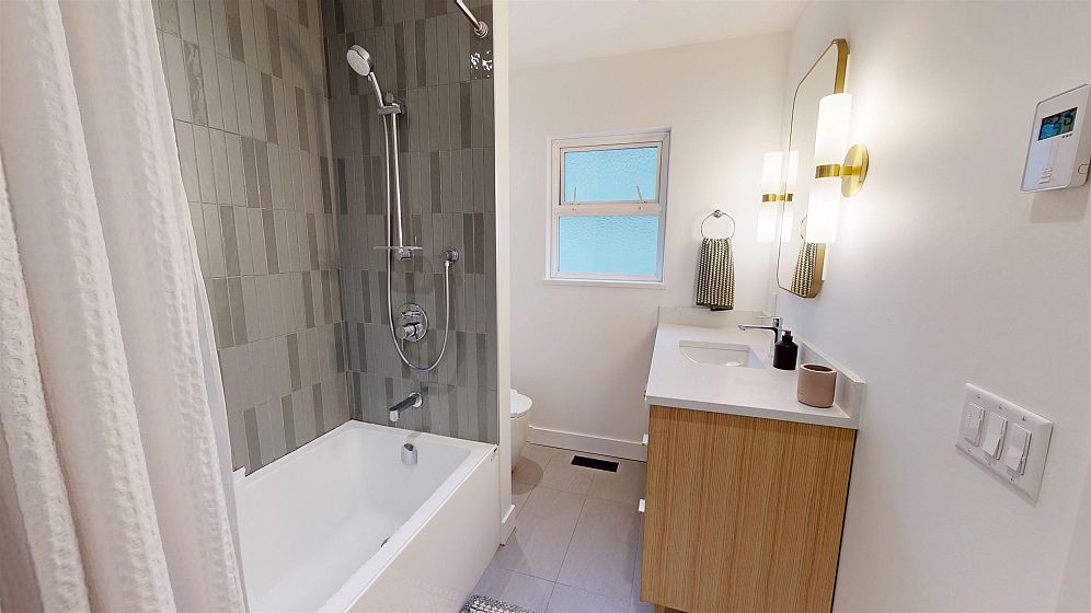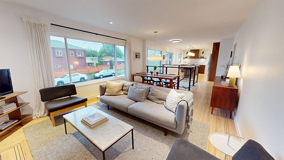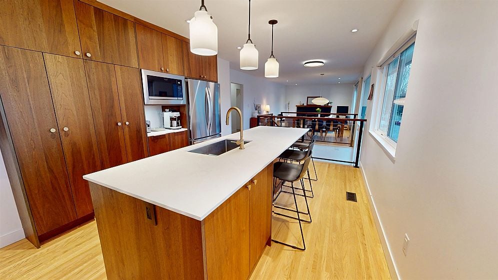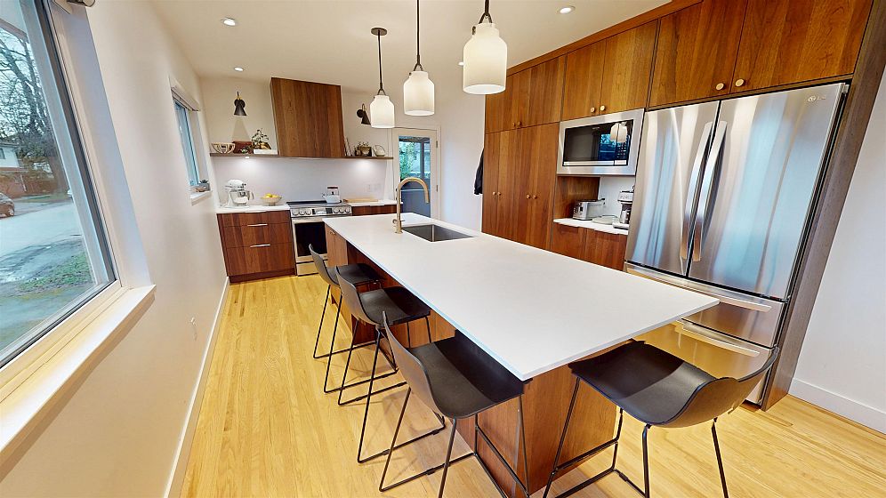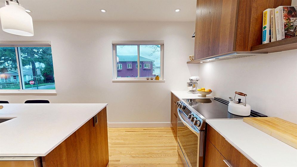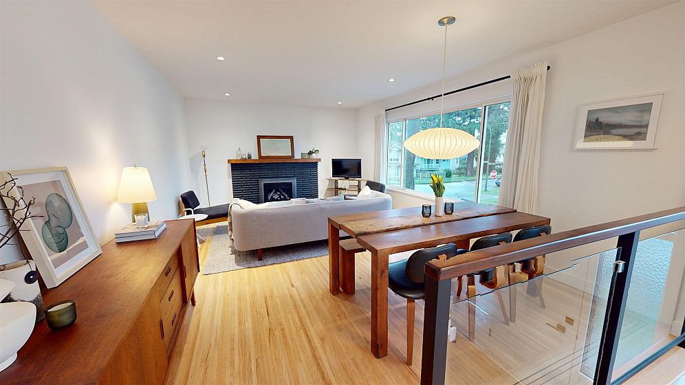 Dramatic Mid Century Makeover. This Bright corner home is steps from South Memorial Park and offers exceptional space and design ethos. Gorgeous Walnut kitchen featuring large island with conversational seating, induction range, Bosch dishwasher, hardwood floors, Valour gas fireplace. 2 spa-like baths up with heated floors. Garden level features media room with gas fireplace, handy 3 pce bath and 4th bedroom. 1 bedroom self-contained unit. Heat pump with AC in 2025, on-demand tankless hot water in 2026. New 200 amp electrical and plumbing upgraded in 2022. Big private deck over double garage and fabulous garden space. This is a good one.