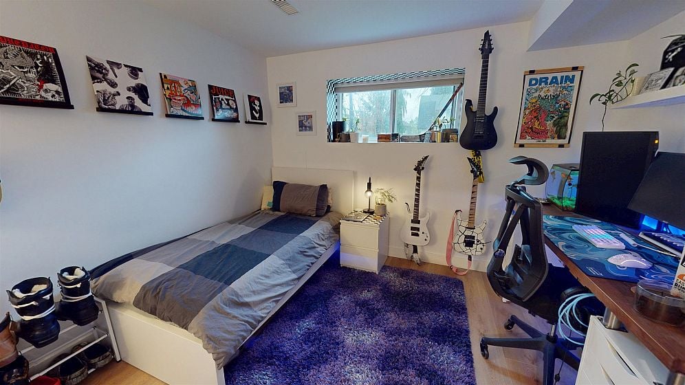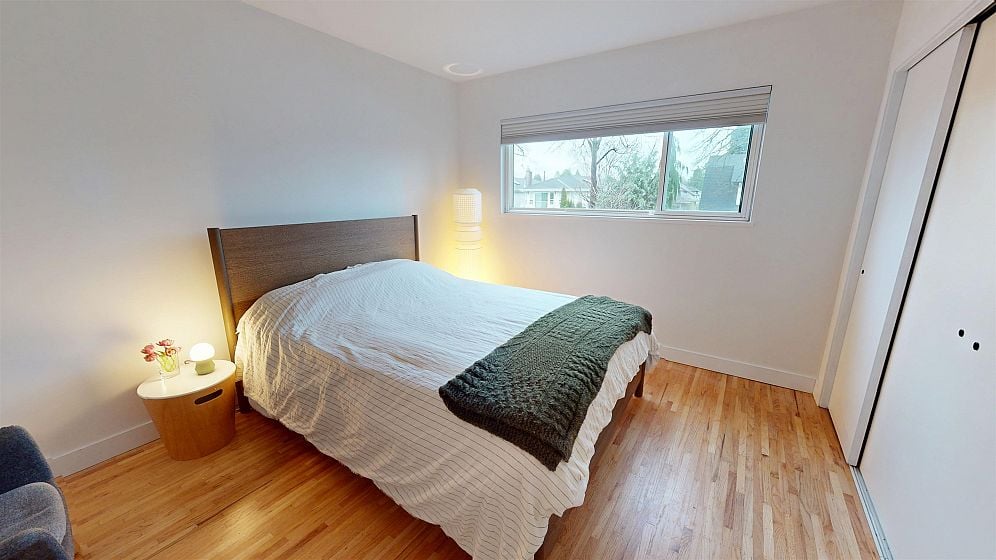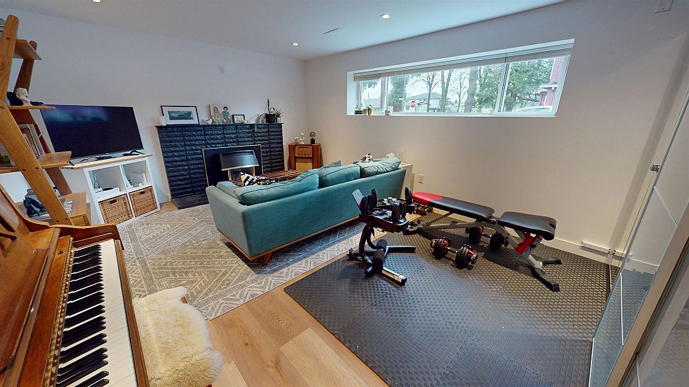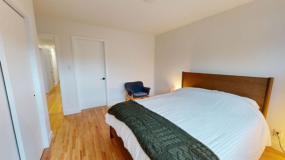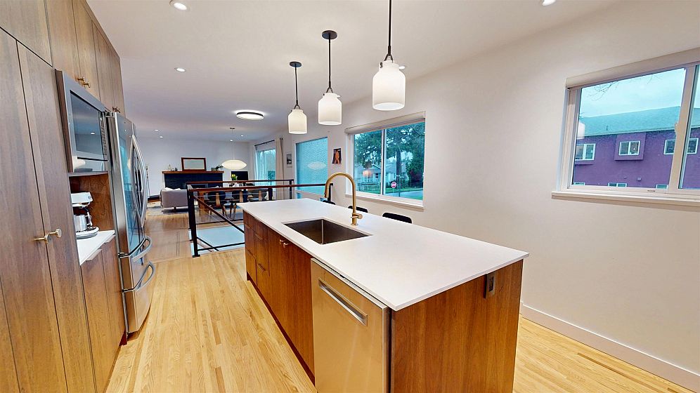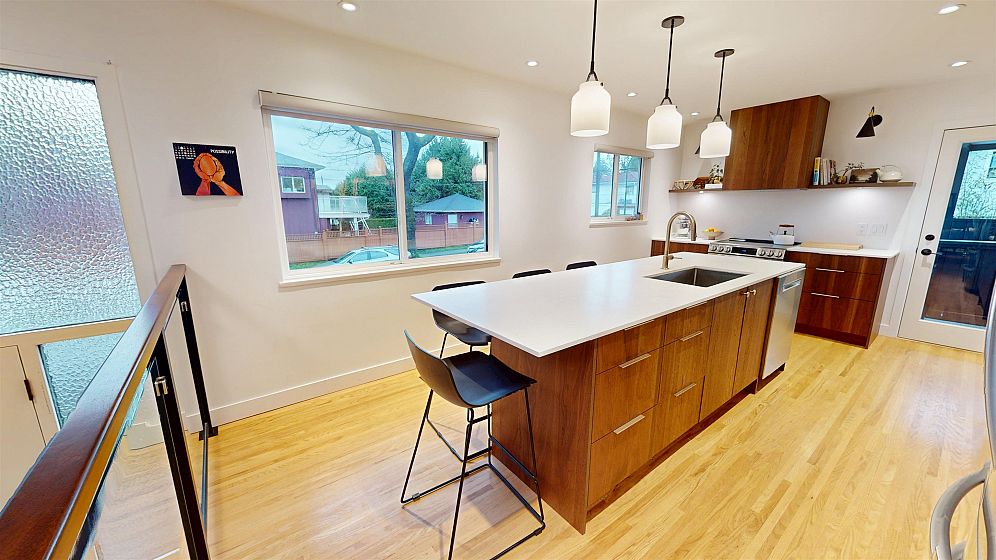 Dramatic Mid Century Makeover. This Bright corner home is steps from South Memorial Park and offers exceptional space and design ethos. Gorgeous Walnut kitchen featuring large island with conversational seating, induction range, Bosch dishwasher, hardwood floors, Valour gas fireplace. 2 spa-like baths up with heated floors. Garden level features media room with gas fireplace, handy 3 pce bath and 4th bedroom. 1 bedroom self-contained unit. Heat pump with AC in 2025, on-demand tankless hot water in 2026. New 200 amp electrical and plumbing upgraded in 2022. Big private deck over double garage and fabulous garden space. This is a good one.