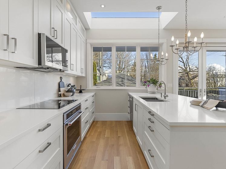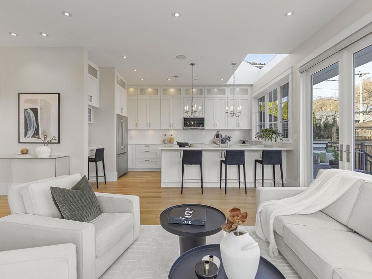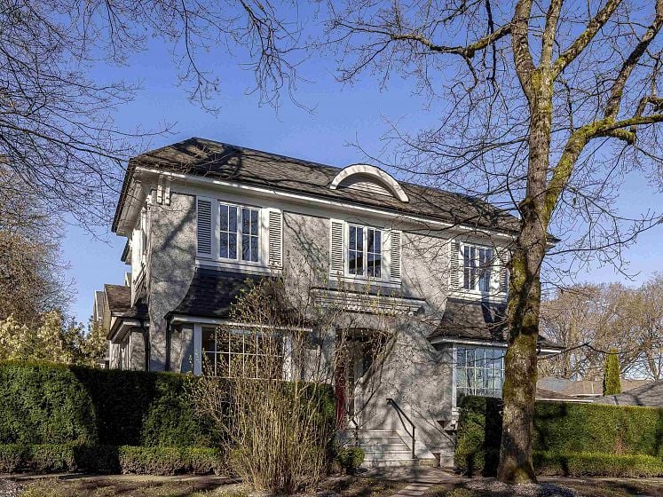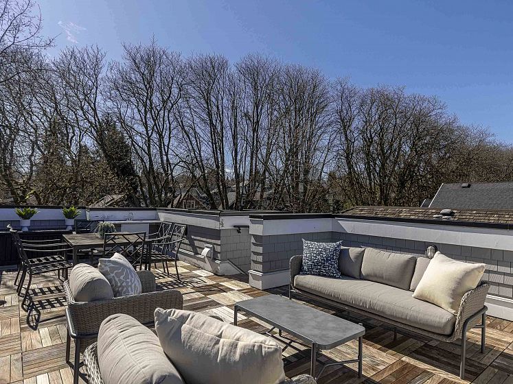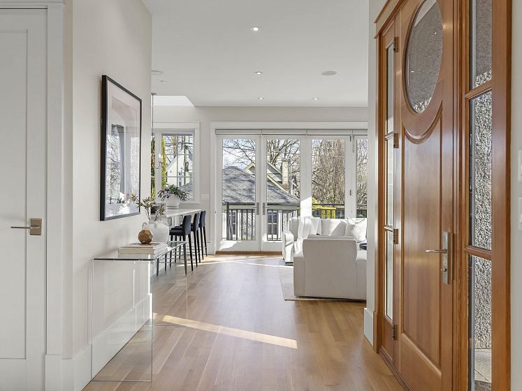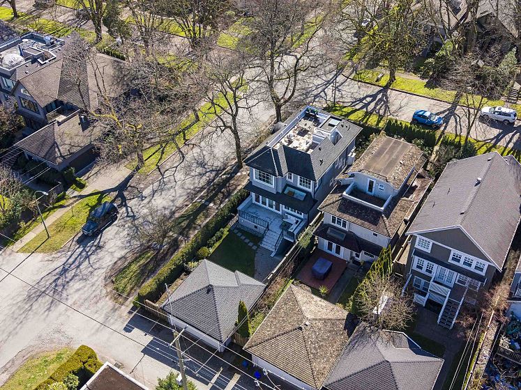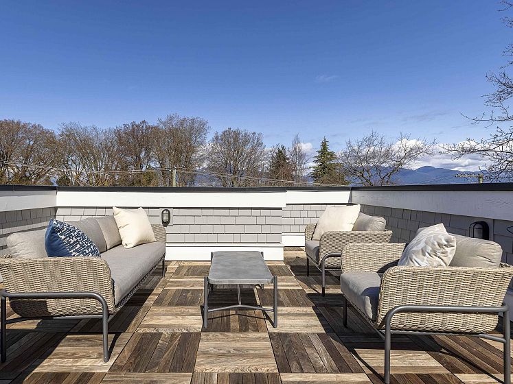 Striking corner-lot residence in the heart of Dunbar, offering a fresh, design-forward take on family living. Clean lines and curated finishes define the main level, where open yet intentional living and dining spaces flow into a chef-inspired kitchen with statement detailing and warm hardwood floors. Floor-to-ceiling expansive folding glass doors extend the living space to an elevated concrete terrace—perfect for indoor-outdoor living. Upstairs, 3 beds include a calming primary suite with WIC & spa-like ensuite. The lower level delivers a refined rec room with a gas fireplace and custom millwork, ideal for relaxed evenings. A private elevator connects all levels. The rooftop deck is a true standout, capturing sweeping mountain, city, and water views. Near top schools, UBC, parks, & more