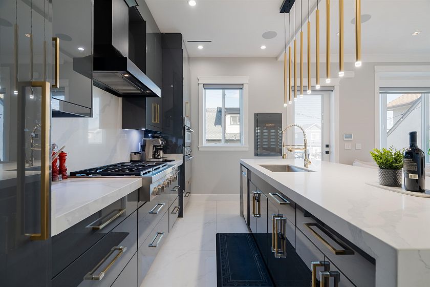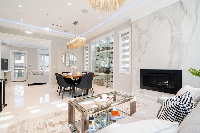 Beautifully designed with exceptional craftsmanship, premium finishes, and a timeless aesthetic throughout. This home was created for entertaining - a gorgeous and grand gourmet chef’s kitchen with a 14-ft waterfall island, soaring 10-ft ceilings, premium appliances, built-in sound system, a beautiful dining room with a feature wine wall and 2 gas fireplaces. Additional features include radiant in-floor heating, air conditioning, EV charging and beautiful landscaping. All 3 bedrooms up have their own en-suite bathrooms plus two legal mortgage helpers (basement & laneway), plus a separate studio nanny/guest suite with a bathroom, kitchenette, and private entrance. This home presents a rare opportunity for elevated living while offering exceptional flexibility and income.