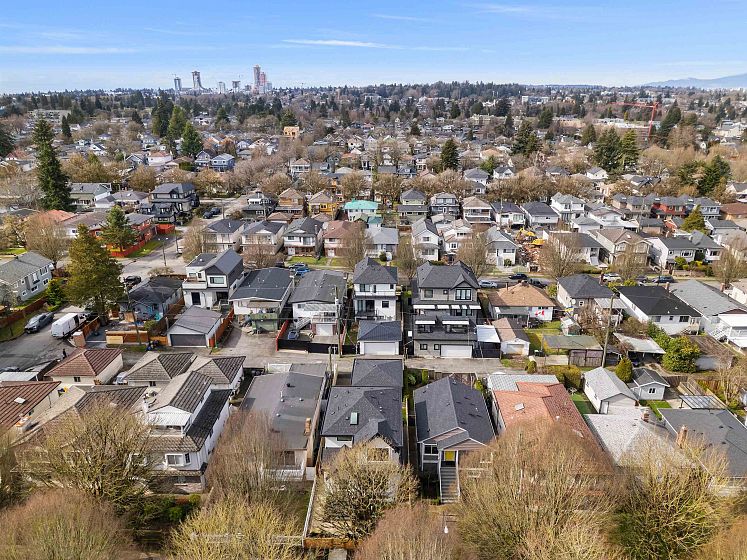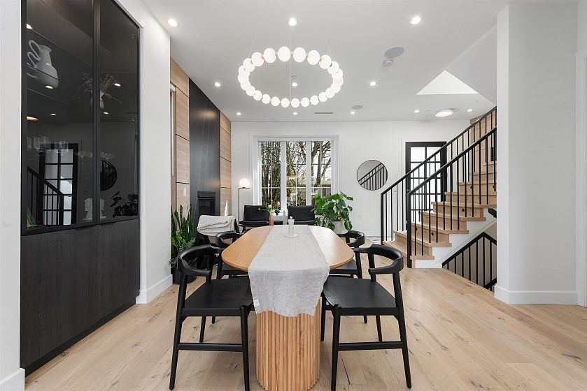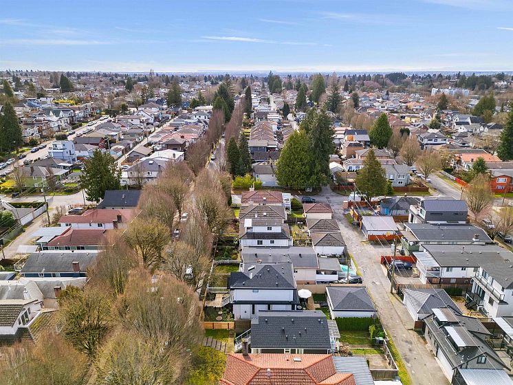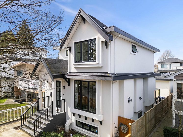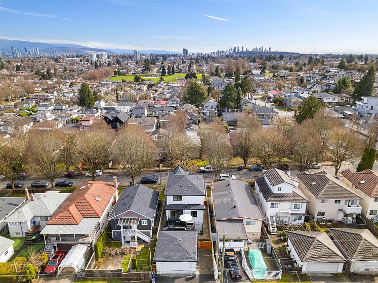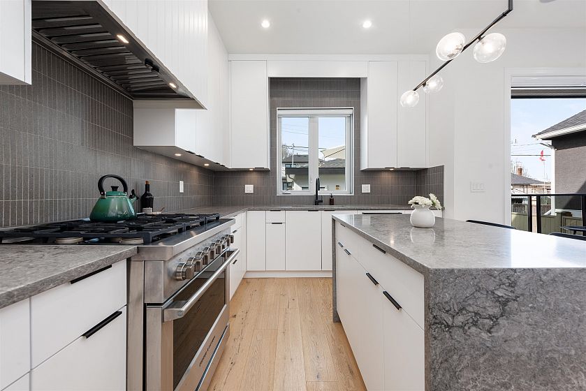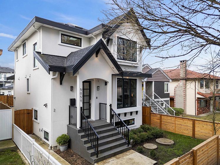 Stunning modern home in Vancouver, between Fraser & Knight! This 5-bed, 5-bath residence blends style and functionality with 10-ft ceilings, a sleek chef’s kitchen, and an open-concept living space. Expansive 12-ft sliding doors lead to a private outdoor area with a dual gas hook up, perfect for entertaining. Upstairs, find three spacious bedrooms, including a luxurious primary suite. The lower level features a legal 2-bed suite with a separate entrance, plus a rec room and full bath—ideal for a home office, gym, or spare bedroom. Enjoy built-in speakers and air conditioning for year-round comfort. A detached 2-car garage plus an extra parking spot provide ample space. Thoughtfully designed with elegant built-ins, warm wood tones, and modern black accents, this home exudes sophistication.