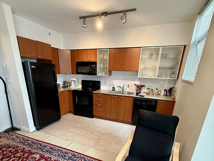 Welcome to this bright, functional and well maintained studio suite with a DEN, perfectly situated on the quiet side of the building. With a sunny balcony overlooking the courtyard and large windows. The layout is versatile and can easily be converted into a one bedroom if desired. Features a spacious kitchen and a full size living room to match your lifestyle needs. The den offers the ideal home office, walk-in closet or extra storage space. Additional conveniences include in-suite laundry, 1 parking, 1 locker and access to a fully equipped gym. Enjoy unbeatable convenience with the public library, supermarket and shops right downstairs. Centrally located with easy access to Metrotown, Downtown. Don't miss this fantastic opportunity!